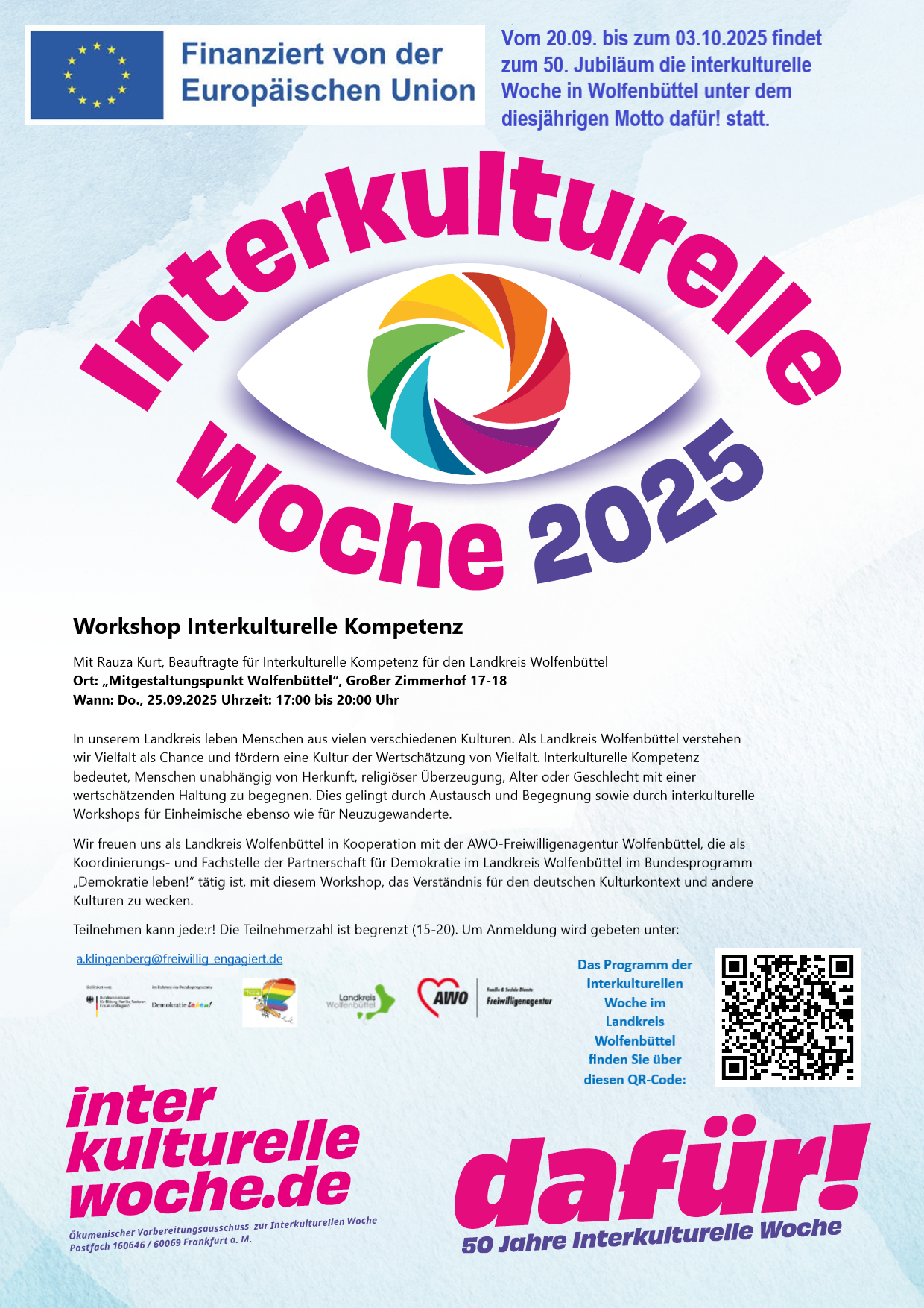 Landkreis. Dieses Jahr findet die bundesweite Interkulturelle Woche bereits zum 50. Mal statt. Unter dem Jubiläumsmotto „dafür!“ werden vom 20. September bis zum 3. Oktober auch im Landkreis Wolfenbüttel zahlreiche Möglichkeiten geboten, an vielfältigen Aktivitäten teilzunehmen und sich dabei interkulturell zu begegnen.