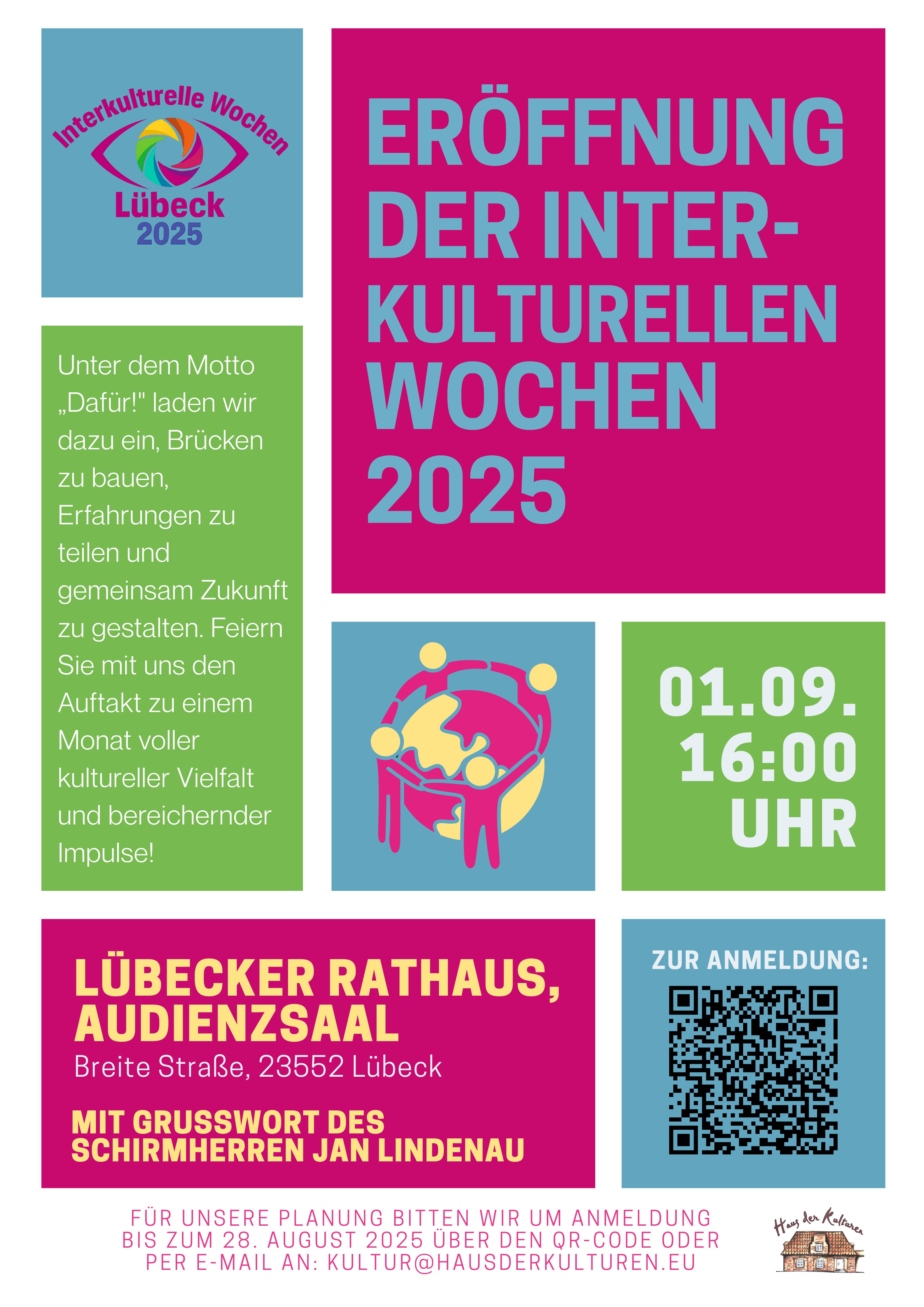 Unter dem Motto »dafür!« organisiert das Haus der Kulturen die »Interkulturellen Wochen« 2025 in Lübeck. Unter der Schirmherrschaft des Lübecker Bürgermeister Jan Lindenau finden im Zeitraum vom 1. September bis zum 3. Oktober 2025 verschiedene Veranstaltungen im Kultur bereich statt: Konzerte, Kreativangebote, Tanz, Ausstellungen, Feste, Vorträge und vieles mehr.