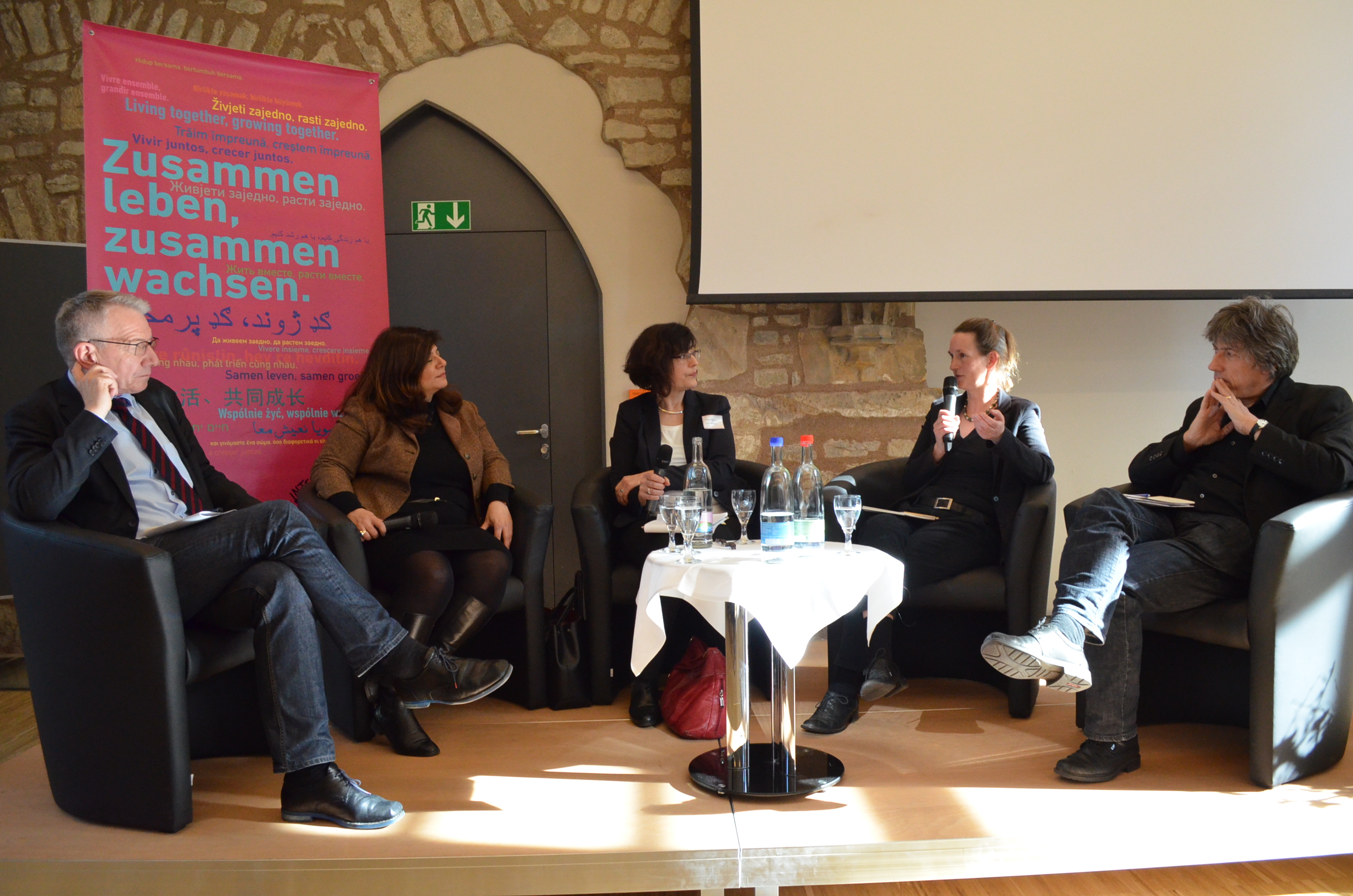 Das Tagungsprogramm startete nach der Begrüßung mit einer Podiumsdiskussion zum Thema "Bedrohte Räume der Vielfaltsgesellschaft". Es diskutierten Suleman Malik (Kommunalpolitiker und Sprecher der Ahmadiyya-Gemeinde Thüringen), der in Erfurt den Bau der ersten Moschee in Ostdeutschland außerhalb Berlins mitorganisiert und sich zahlreichen Anfeindungen ausgesetzt sieht, Dotschy Reinhardt (Musikerin, Autorin und Vorsitzende des Landesrates der Roma und Sinti Berlin-Brandenburg) und Christian Staffa, Studienleiter der Evangelischen Akademie zu Berlin und Antisemitismusbeauftragter der Evangelischen Kirche in Deutschland (EKD). Moderiert wurde die Runde von Beate Sträter, der Vorsitzenden der Fachgruppe Christen und Muslime in der Evangelischen Kirche im Rheinland. Eine Erkenntnis der Runde: Der Rassismus, der jetzt wieder stärker in Deutschland zutage tritt, war nie weg. "Das betrifft mich nicht erst jetzt. Ich bin mit Diskriminierung aufgewachsen", sagte etwa Reinhard, die als Sintezza in der Nähe von Ravensburg groß wurde.