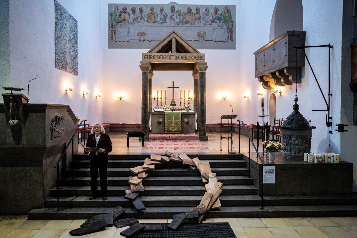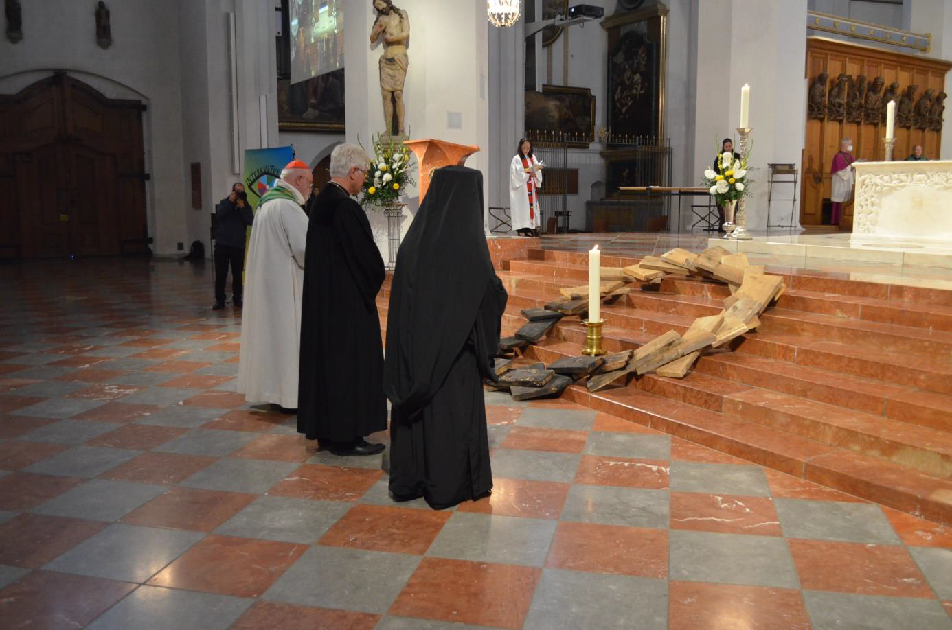 Während der Fürbitten im Auftaktgottesdienst wurden die fehlenden Teile eingesammelt und wieder an ihre alte Stelle im Kreis gelegt. Der Ring, als Symbol der Gemeinschaft von Menschen unterschiedlichster Herkunft, Kultur und Religion, ist jetzt wieder geschlossen. Was bleibt, sind die schwarzen Spuren der Verletzungen. Das schrittweise Wieder-Zusammenfügen des Kreises stand symbolisch für den Prozess der Heilung einer starken Vielfaltsgesellschaft, die bleibende Wunden nicht überspielt.