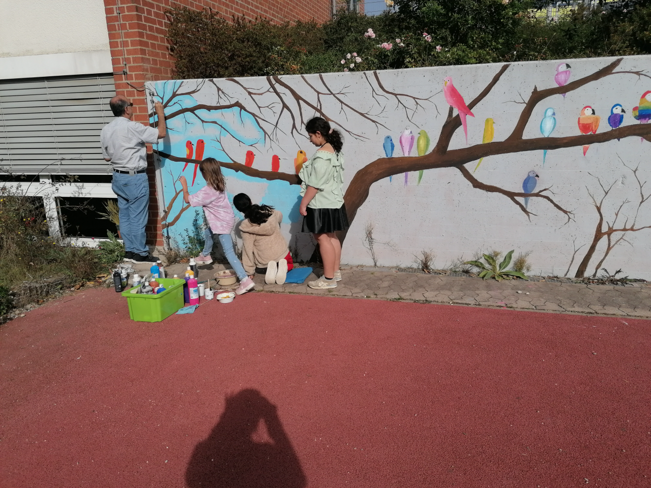 Neben Friedenstauben, die verschiedene Flaggen der Herkunftsländer unserer Schüler zierten, wurden Postkarten mit dem Logo der interkulturellen Woche gestaltet. Diese werden an Betriebe und Institutionen ausgeteilt mit dem Aufruf, diese in die Fenster zu hängen. Mit Tablets wurden Collagen gefertigt, die dann ausgedruckt unsere Schulhausfenster schmücken werden. Die Notwendigkeit, Mauern im Kopf einzureißen, soll hier verdeutlicht werden. Im Schulhof entstand unter Anleitung des syrischen Künstlers Moneer Ballish ein Großkunstwerk, das auch die nächsten Wochen und Monate immer wieder an diesen Tag erinnern wird.