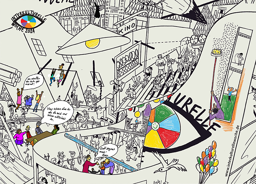 Das Wimmelbild wird auch 2025 im Shop der Interkulturellen Woche zur Verfügung stehen. Die Materialien können ab etwa Mitte Mai bestellt werden.