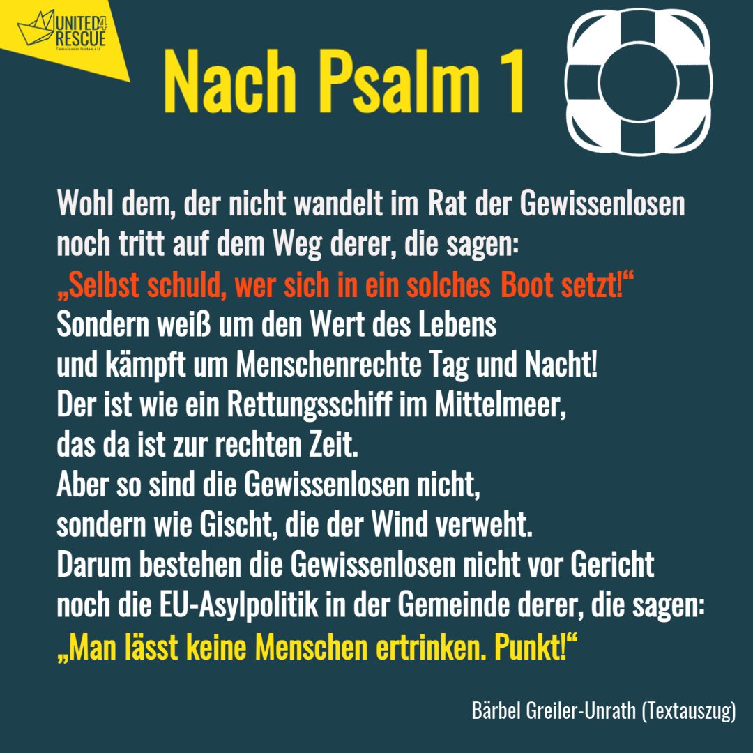Dietlind Jochims, Rafael Nikodemus, Thorsten Leißer, Sandra Bils und anderen haben in einer kreativen Schreibwerkstatt für die Organisation United4Rescue Psalmen, Textcollagen und mehr für Gottesdienste und Andachten in dieser Zeit erstellt. Sie können auch für Veranstaltungen mit Bezug zum Thema Flucht im Rahmen der Interkulturellen Woche genutzt werden, etwa zum „Tag des Flüchtlings“ am 1. Oktober 2021.