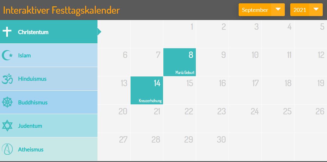Innerhalb eines jeden Jahres sind Feiertage besondere Höhepunkte, auf die sich die Menschen freuen. Die Menschen sind sich jedoch über den Ursprung solcher Feste und deren Tradition oft nicht mehr bewusst. Das kostenlose E-Book “Festtags-Guide: Bräuche, Feste, Feiertage – so vielfältig feiert Deutschland“ informiert über die Ursprünge der verschiedenen Feste und deren Bräuche. Ein interaktiver Kalender zeigt, wann diese Feste gefeiert werden. Datum, Anlass und Herkunft werden näher erklärt. Damit ist er auch für Organisierende der Interkulturellen Woche hilfreich, wenn religiöse Feste und Bräuche thematisiert werden sollen.