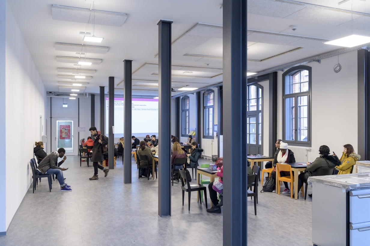 Dass das IWC etwas Besonderes ist, wird bereits im Wartebereich der Ausländerbehörde deutlich. Kein kalter Behördenflur, sondern ein luftiger Raum mit Säulen, einer Kaffeebar auf der einen und einer kleinen Bühne auf der anderen Seite. Denn wo tagsüber die Kunden der Behörde warten, finden abends Lesungen oder Partys statt, veranstaltet vom Interkulturellen Zentrum (IZ).