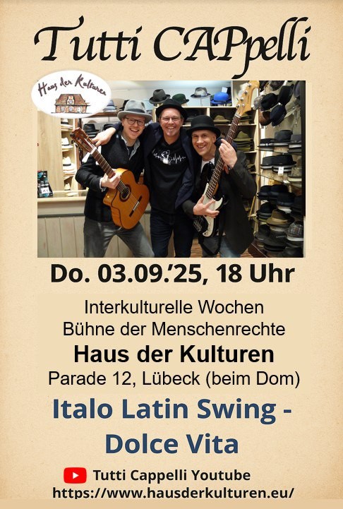 Unter dem Motto »dafür!« organisiert das Haus der Kulturen die »Interkulturellen Wochen« 2025 in Lübeck. Unter der Schirmherrschaft des Lübecker Bürgermeister Jan Lindenau finden im Zeitraum vom 1. September bis zum 3. Oktober 2025 verschiedene Veranstaltungen im Kultur bereich statt: Konzerte, Kreativangebote, Tanz, Ausstellungen, Feste, Vorträge und vieles mehr.