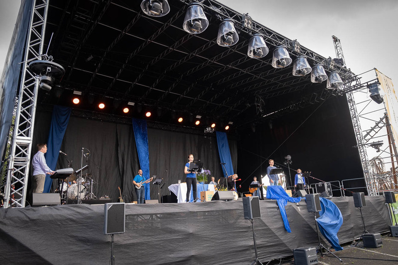 Beteiligt an den Vorbereitungen waren viele Haupt- und Ehrenamtliche der Bottroper Kirchengemeinden, ebenso von der Integrationsagentur und vom Mehrgenerationenhaus – alles Akteur*innen, die auch die Interkulturelle Woche mitgestalten. Der Aufwand war immens: Die Band probte intensiv, die Mitglieder des Gospelchores ebenso, allerdings jeder für sich – gemeinsames Üben war nicht erlaubt. Auf der 16 Meter breiten Bühne war dann jedoch Platz genug, um den erforderlichen abstand einzuhalten. Rund 600 Folien mit Liedtexten wurden erstellt, die dann auf die riesige Leinwand projiziert wurden. Denn Schwerpunkt des Programms war das gemeinsame Singen, das viele in der Corona-Zeit schmerzlich vermissen.