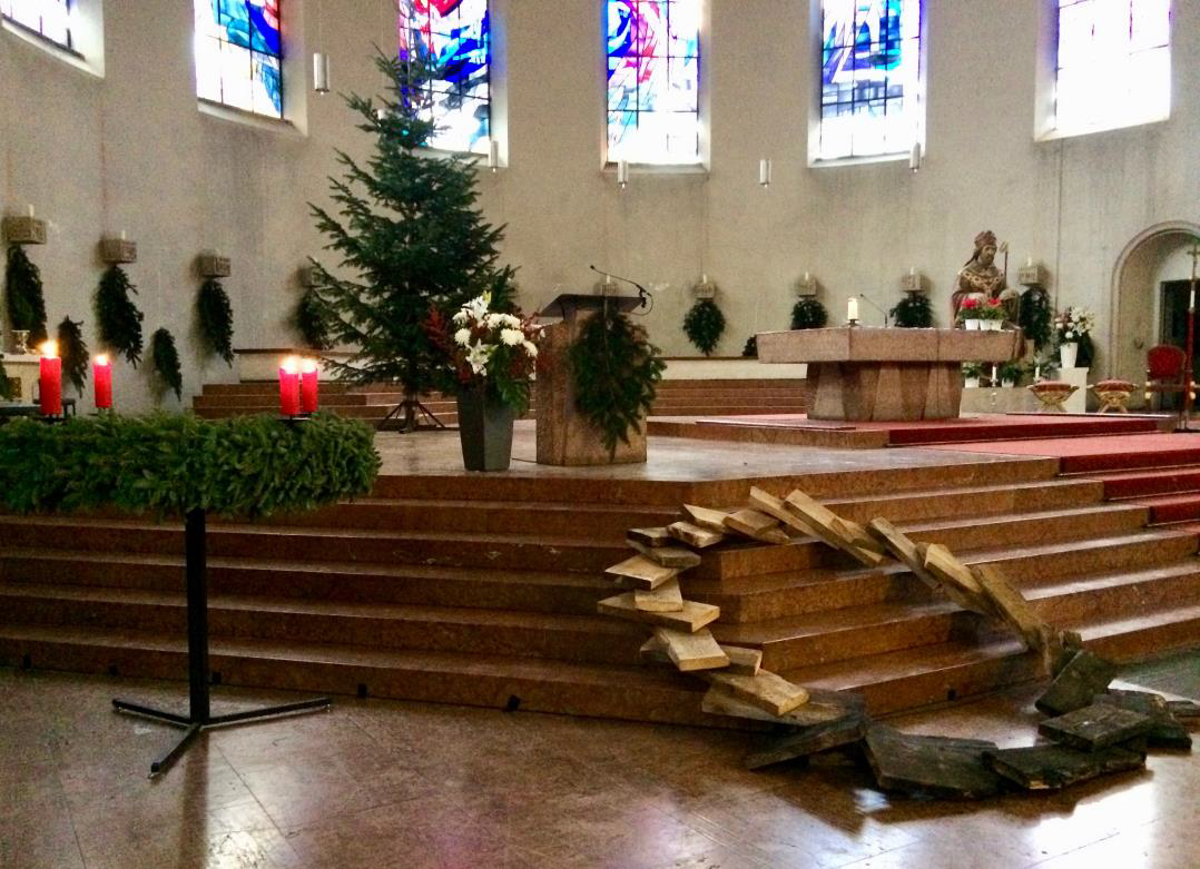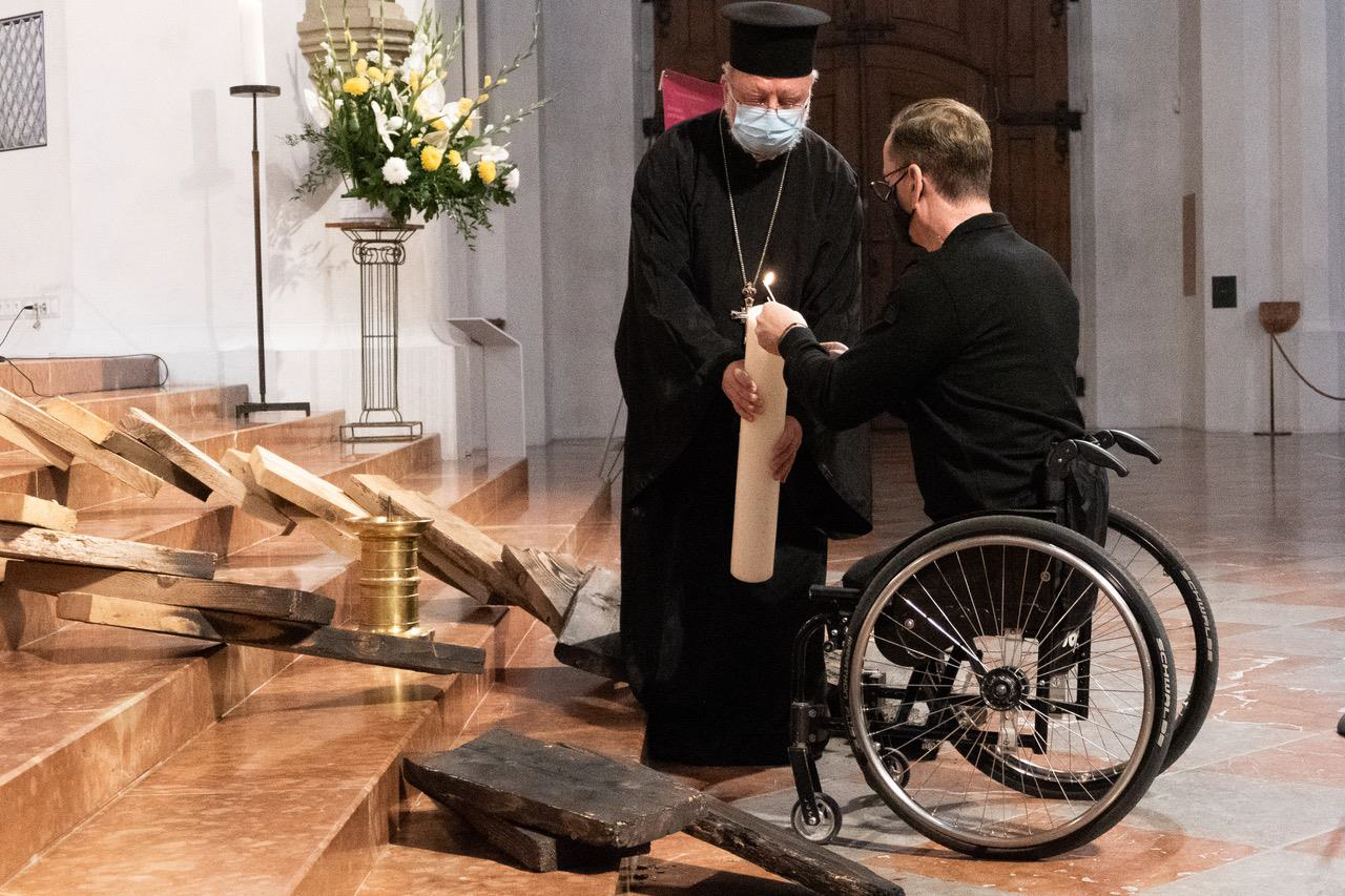 Während der Fürbitten im Auftaktgottesdienst wurden die fehlenden Teile eingesammelt und wieder an ihre alte Stelle im Kreis gelegt. Der Ring, als Symbol der Gemeinschaft von Menschen unterschiedlichster Herkunft, Kultur und Religion, ist jetzt wieder geschlossen. Was bleibt, sind die schwarzen Spuren der Verletzungen. Das schrittweise Wieder-Zusammenfügen des Kreises stand symbolisch für den Prozess der Heilung einer starken Vielfaltsgesellschaft, die bleibende Wunden nicht überspielt.