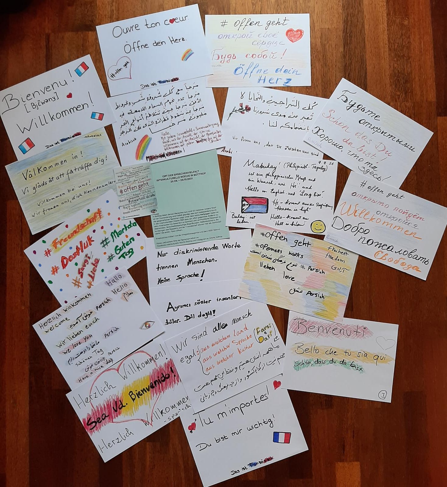 Bottroper Sprachenvielfalt sichtbar machen, auch in sozialen Medien. Wir möchten u.a. auf der IKW-Facebookseite-Bottrop, auf Instagram: Evangelische Kirche Bottrop, Orte und Fotos von diesen Orten zeigen. Dazu bitten wir uns Fotos der gestalteten Orte ggfs. mit Ortsangabe/Adresse zukommen zu lassen. Sofern gewünscht, können die Ausstellungen dann auch vor Ort besucht werden, Kontakte können aufgenommen werden und Bottroper*innen können miteinander ins Gespräch kommen, sich über das Thema Verständigung austauschen, Worte oder Redewendungen in einer anderen Sprache lernen…o.ä.
