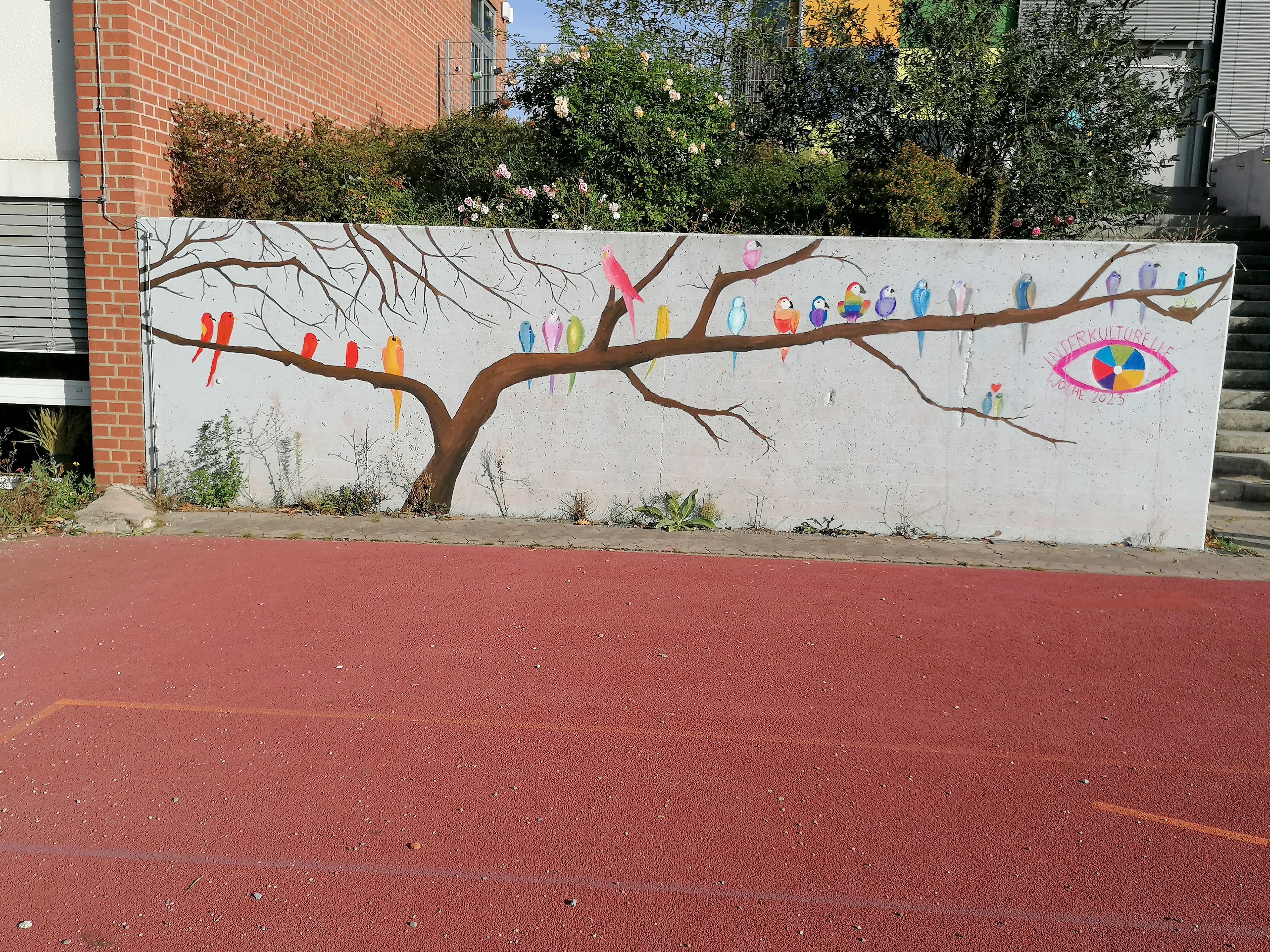Neben Friedenstauben, die verschiedene Flaggen der Herkunftsländer unserer Schüler zierten, wurden Postkarten mit dem Logo der interkulturellen Woche gestaltet. Diese werden an Betriebe und Institutionen ausgeteilt mit dem Aufruf, diese in die Fenster zu hängen. Mit Tablets wurden Collagen gefertigt, die dann ausgedruckt unsere Schulhausfenster schmücken werden. Die Notwendigkeit, Mauern im Kopf einzureißen, soll hier verdeutlicht werden. Im Schulhof entstand unter Anleitung des syrischen Künstlers Moneer Ballish ein Großkunstwerk, das auch die nächsten Wochen und Monate immer wieder an diesen Tag erinnern wird.