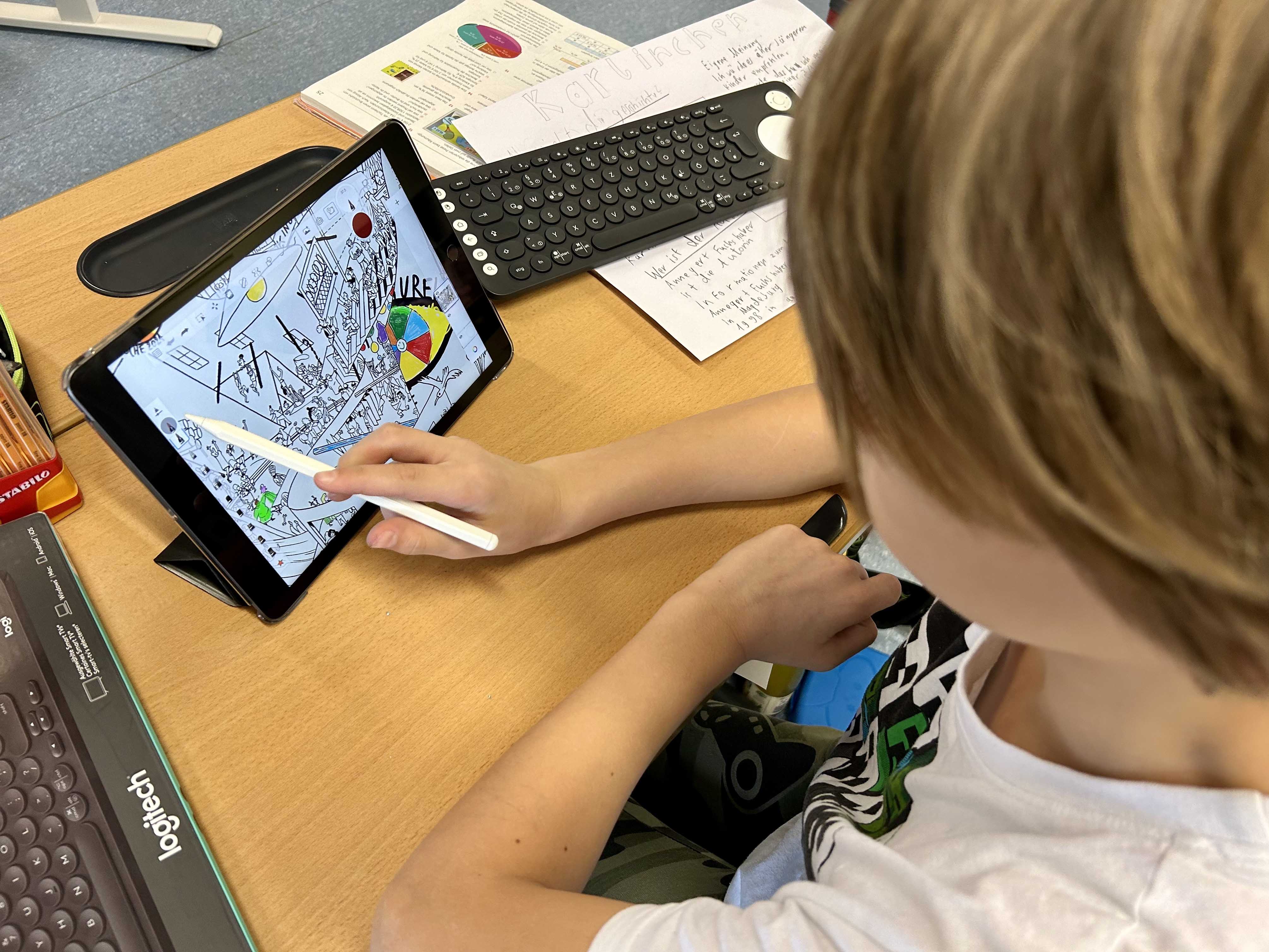 Die Siebtklässler:innen setzten sich zunächst inhaltlich mit dem Begriff "Rassismus" auseinander. Danach gestalteten sie im Rahmen des Kunstunterrichts individuell ausgewählte Szenen des Wimmelbilds am Tablet und ergänzten sie mit aussagekräftigen Sprechblasen zum Thema.
