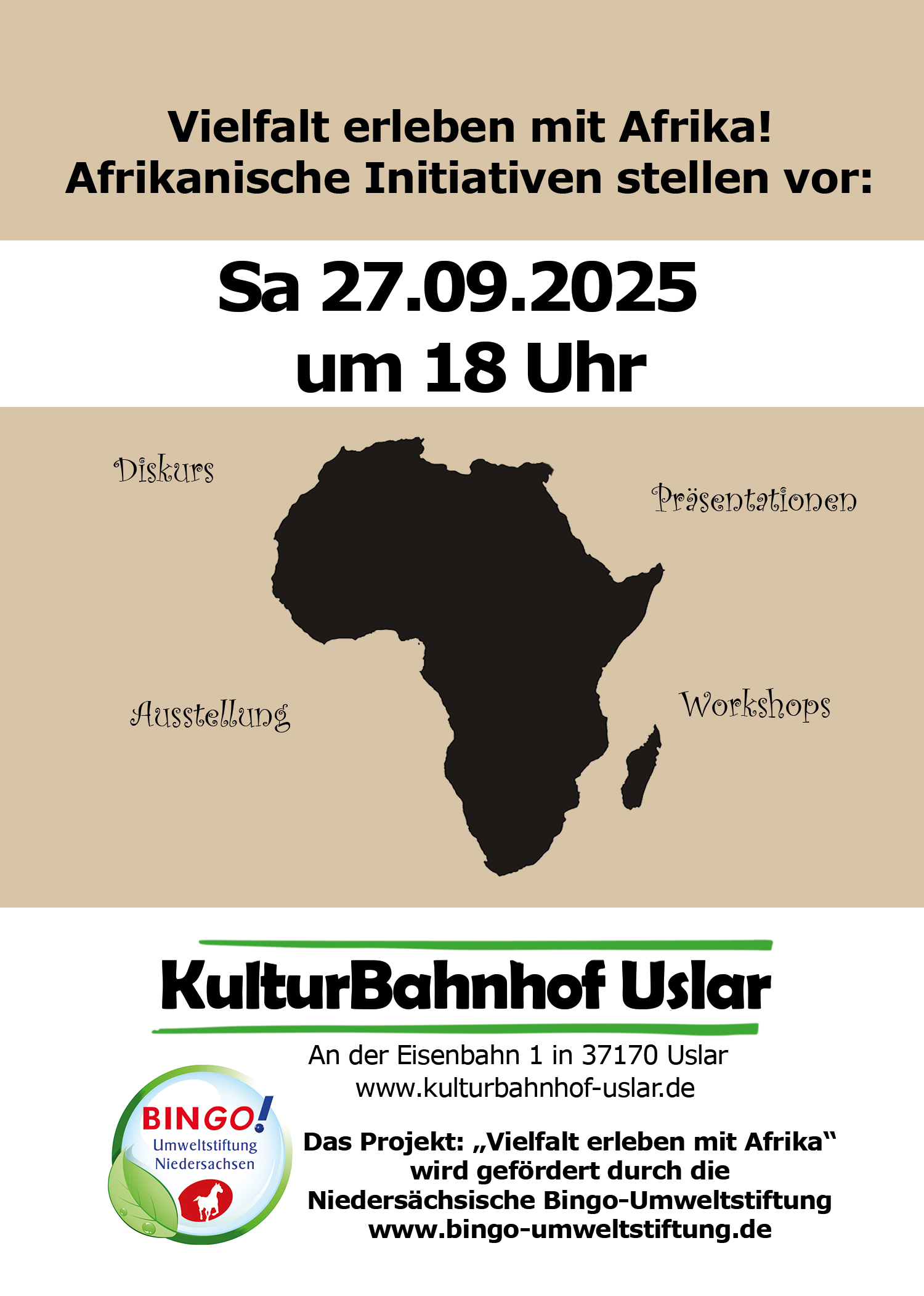 Am 27.9.2025 findet im Kulturbahnhof Uslar die Veranstaltung:" Vielfalt erleben mit Afrika!: Afrikanische Initiativen stellen vor" statt.