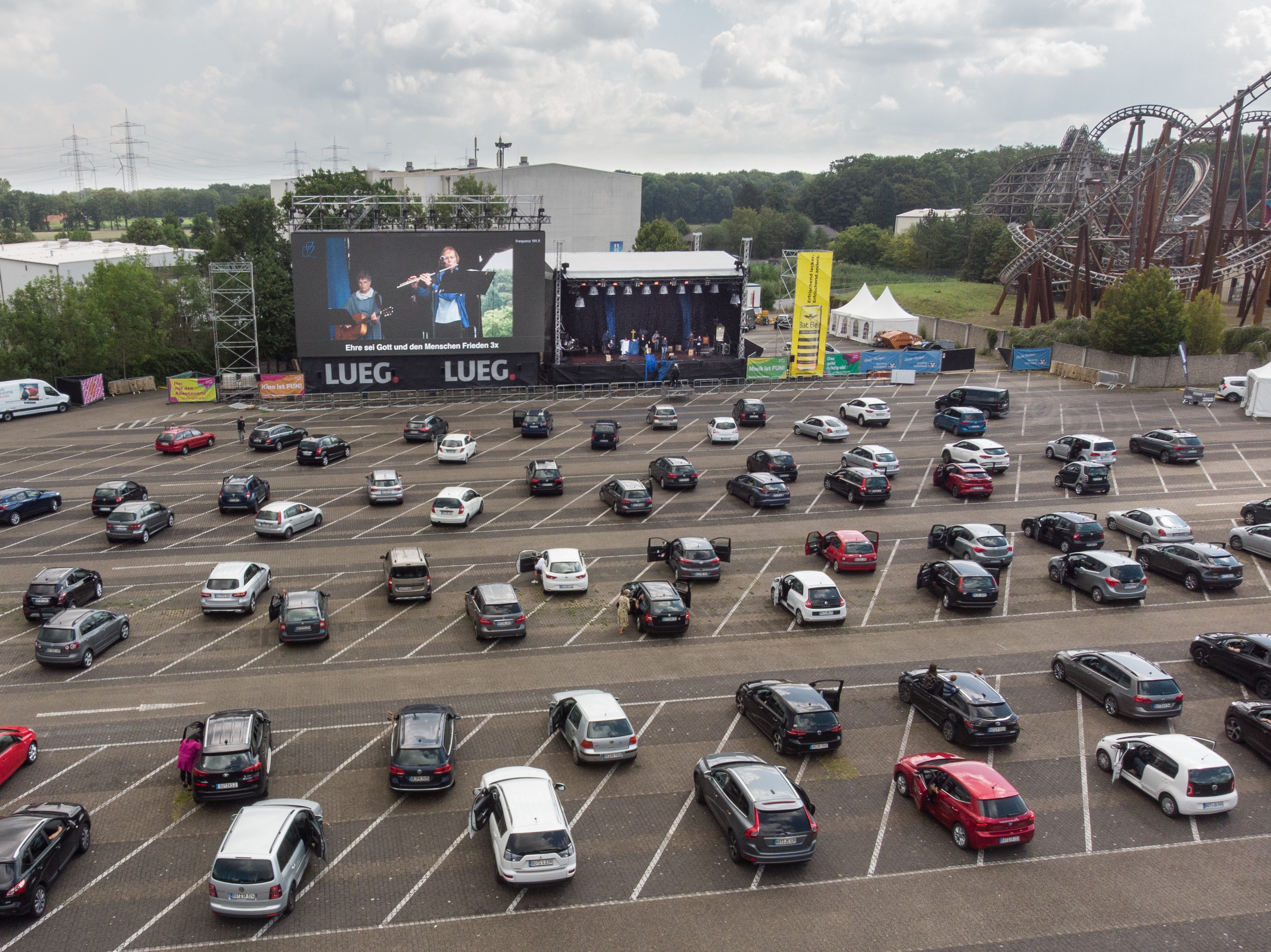 Das Ergebnis von zwei Wochen intensiver Vorbereitung war ein stimmungsvoller Gottesdienst mit 150 Fahrzeugen an einem ungewöhnlichen Ort. Denn das Autokino befindet sich direkt neben Movie Park, wo die Besucher*innen eher weniger die spirituelle Einkehr suchen, sondern den Nervenkitzel. So fand der Gottesdienst am 26. Juli 2020 vor der Kulisse riesiger Achterbahnen statt, von denen immer mal wieder das Kreischen der Fahrgäste herüberschwang.