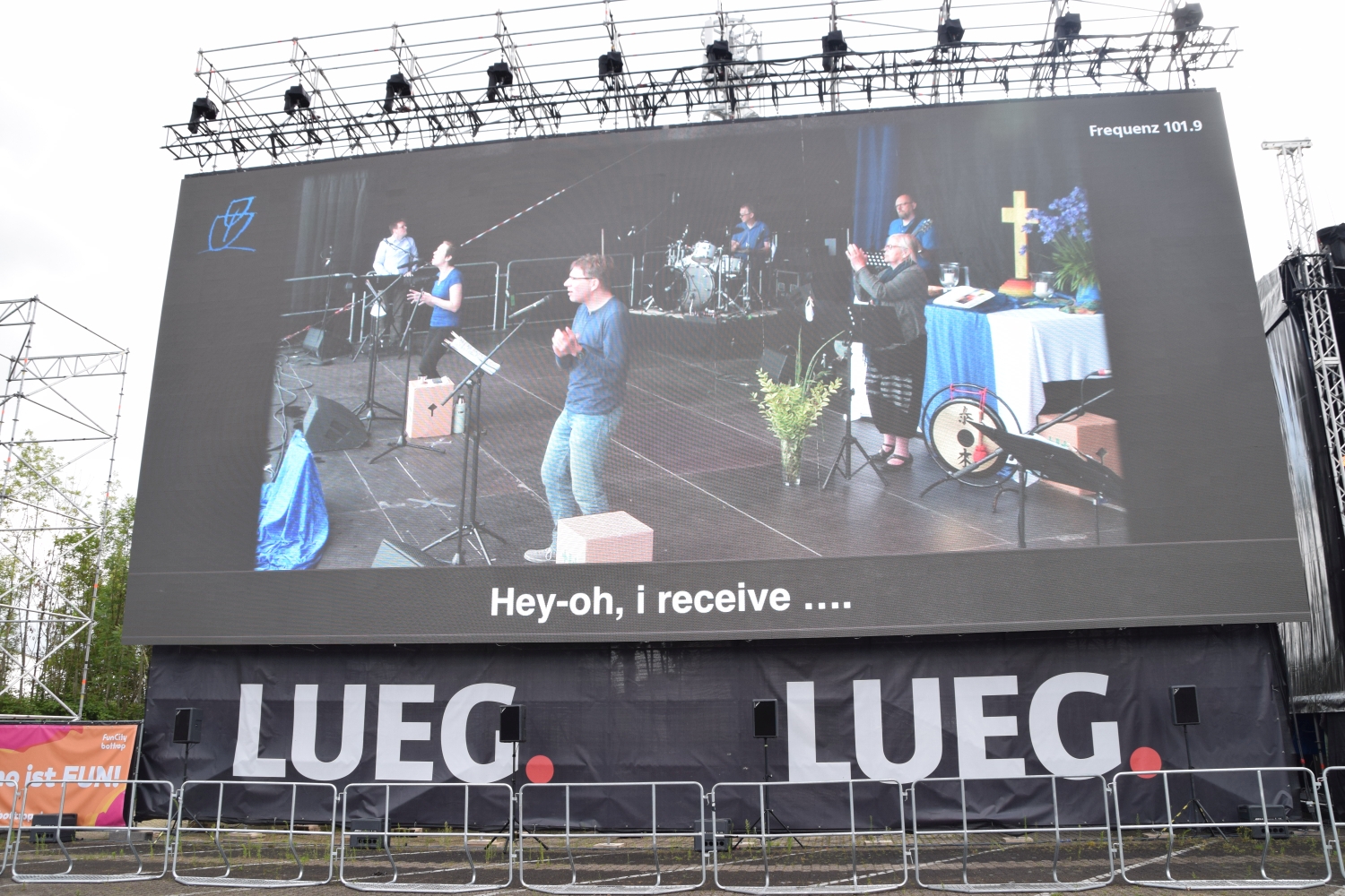 Beteiligt an den Vorbereitungen waren viele Haupt- und Ehrenamtliche der Bottroper Kirchengemeinden, ebenso von der Integrationsagentur und vom Mehrgenerationenhaus – alles Akteur*innen, die auch die Interkulturelle Woche mitgestalten. Der Aufwand war immens: Die Band probte intensiv, die Mitglieder des Gospelchores ebenso, allerdings jeder für sich – gemeinsames Üben war nicht erlaubt. Auf der 16 Meter breiten Bühne war dann jedoch Platz genug, um den erforderlichen abstand einzuhalten. Rund 600 Folien mit Liedtexten wurden erstellt, die dann auf die riesige Leinwand projiziert wurden. Denn Schwerpunkt des Programms war das gemeinsame Singen, das viele in der Corona-Zeit schmerzlich vermissen.