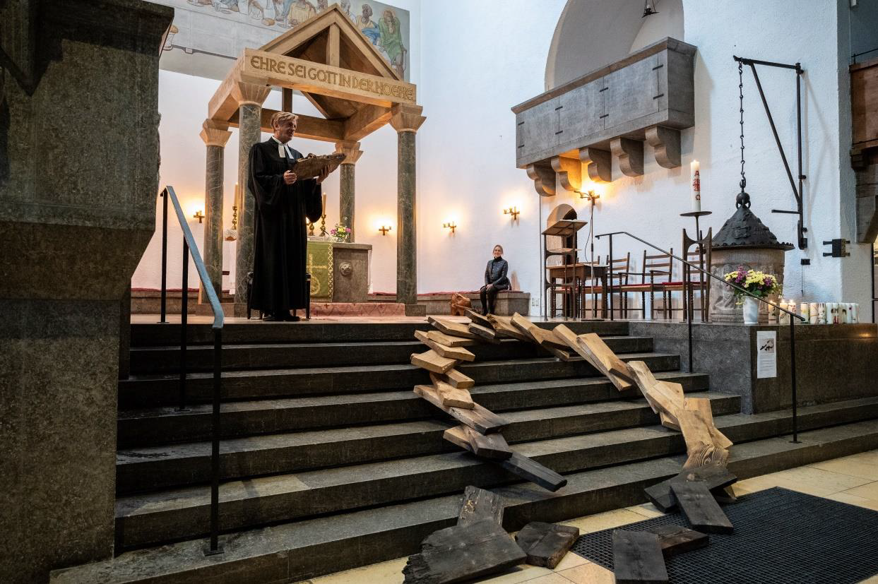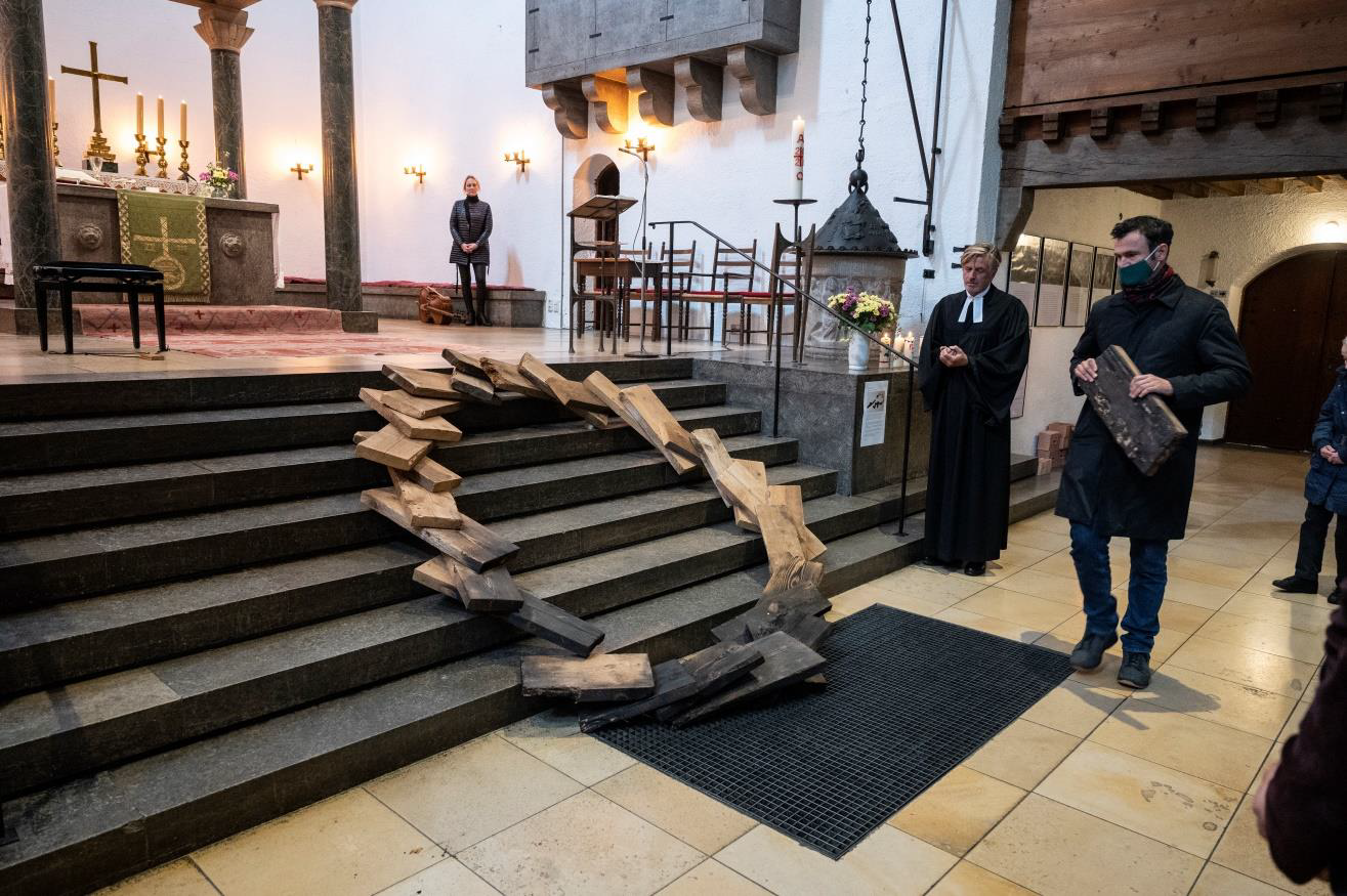 Während der Fürbitten im Auftaktgottesdienst wurden die fehlenden Teile eingesammelt und wieder an ihre alte Stelle im Kreis gelegt. Der Ring, als Symbol der Gemeinschaft von Menschen unterschiedlichster Herkunft, Kultur und Religion, ist jetzt wieder geschlossen. Was bleibt, sind die schwarzen Spuren der Verletzungen. Das schrittweise Wieder-Zusammenfügen des Kreises stand symbolisch für den Prozess der Heilung einer starken Vielfaltsgesellschaft, die bleibende Wunden nicht überspielt.
