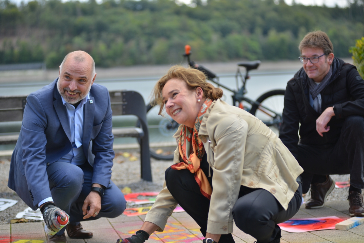 Unter der Anleitung des Künstlers Marcel Veneman fand hatte schon 2021 eine kreative Solidaritätsaktion stattgefunden, um zu zeigen, wie offen und friedlich die Stadt Arnsberg und Ihre Bewohner*innen sind. Gemeinsam kreierten 120 Arnsberger einen bunten Pfad auf dem Ruhrtalradweg als sichtbares Zeichen für den Frieden. Mit bereit gestellten Schablonen, in denen das Wort Frieden in 25 Sprachen zur Auswahl stand, und Sprühfarben konnte jeder seine Fläche gestalten.