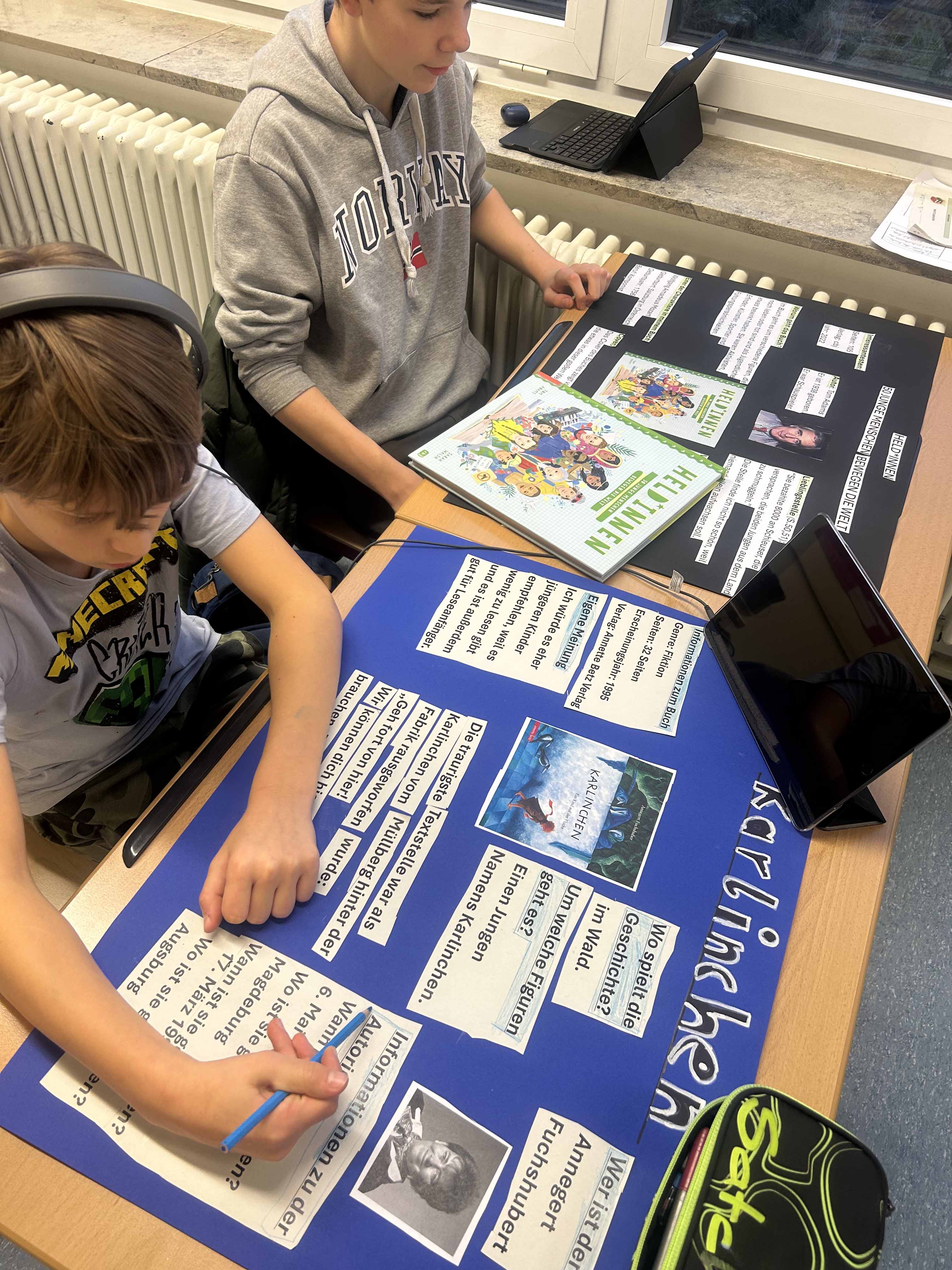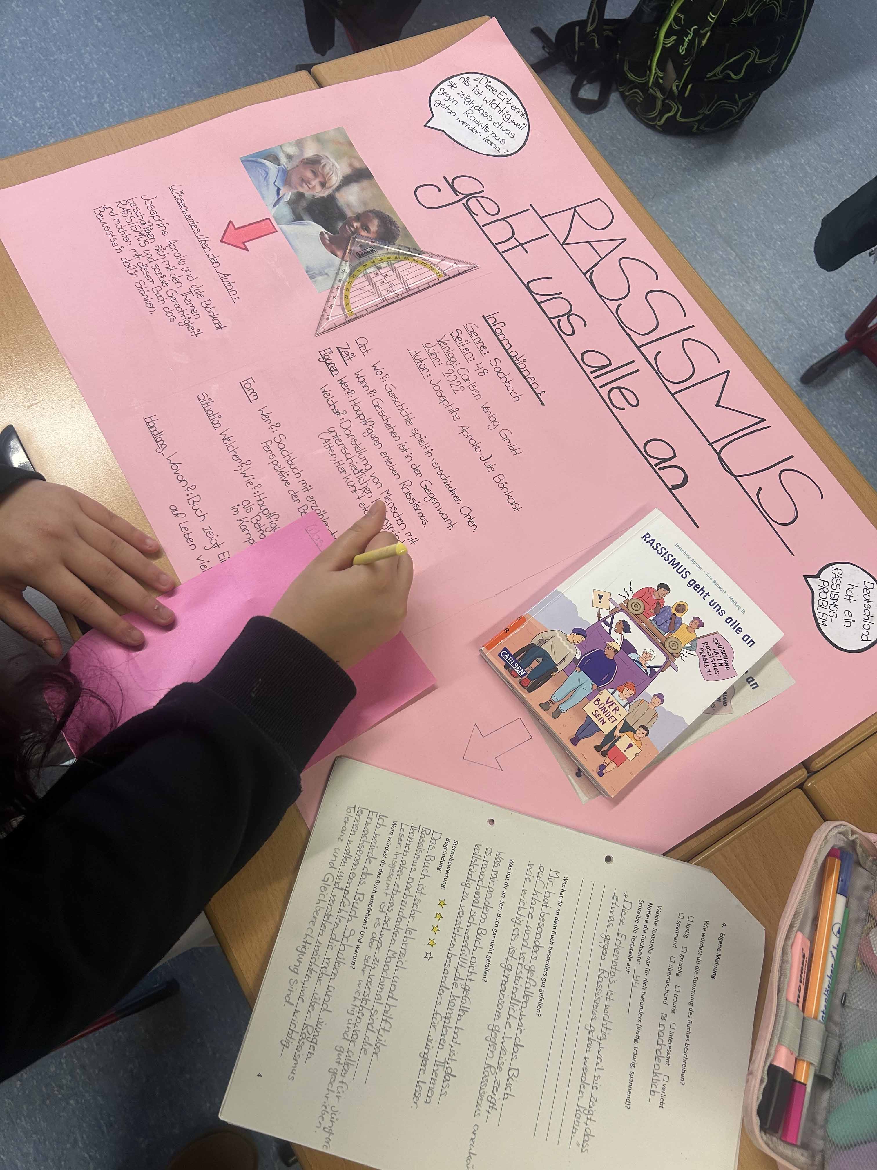 Die Kunstwerke wurden schließlich im Schulgebäude ausgestellt, dazu wurde passende Literatur aus der Gemeindebücherei anhand einer Buchvorstellung in Plakatform präsentiert. Das sollte alle Schüler:innen zu erreichen, zu sensibilisieren und zum Lesen anzuregen.
