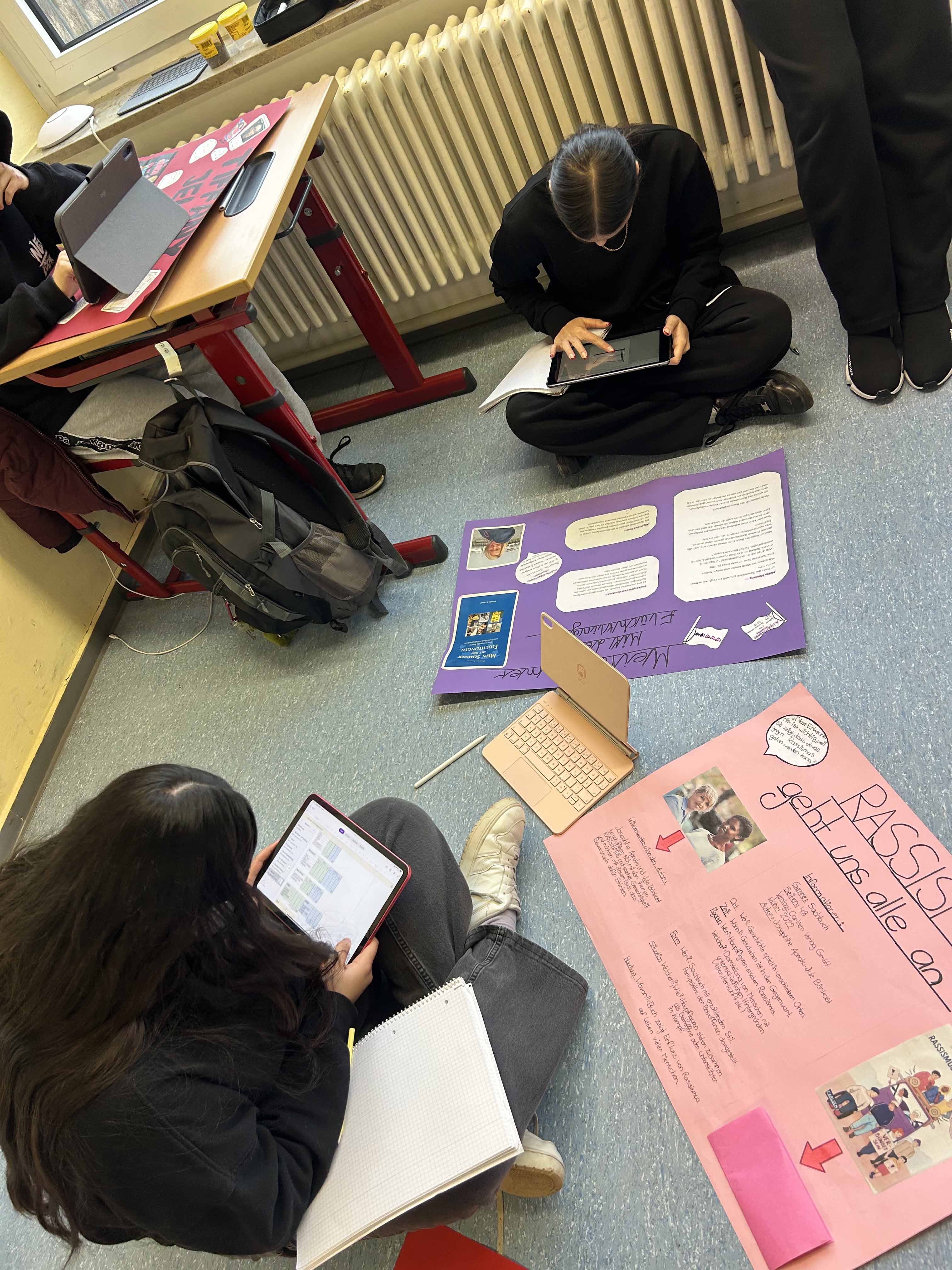 Die Siebtklässler:innen setzten sich zunächst inhaltlich mit dem Begriff "Rassismus" auseinander. Danach gestalteten sie im Rahmen des Kunstunterrichts individuell ausgewählte Szenen des Wimmelbilds am Tablet und ergänzten sie mit aussagekräftigen Sprechblasen zum Thema.