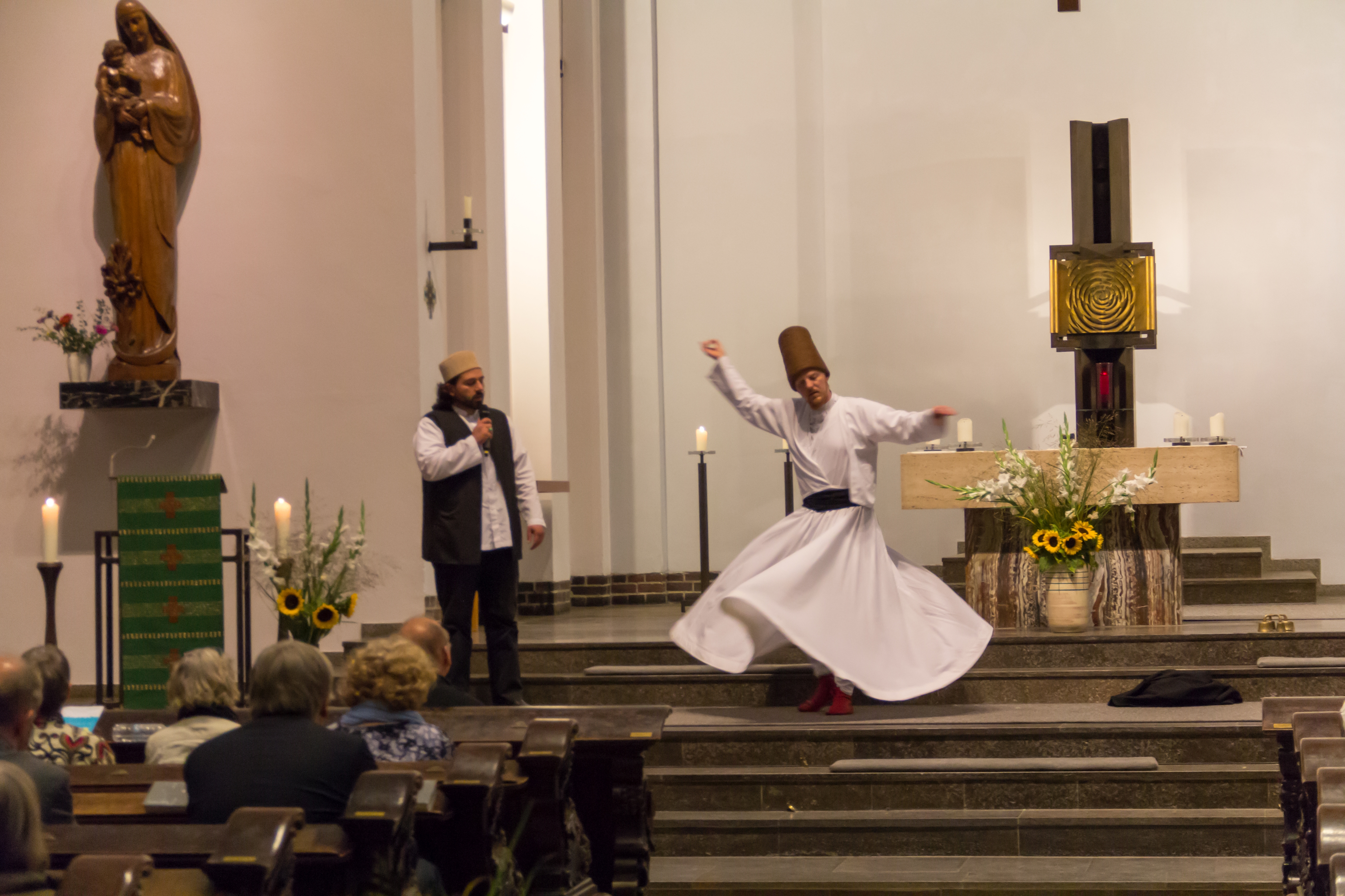 Den Abschluss des Friedensgebetes bildeten ein Segen von Manuel Katanacho (Islamisches Kultur- und Erziehungszentrum Neukölln), Itai Böing und Lissy Eichert sowie ein Gesang mit Tanz von Hajji Emrah Gençaslan und dem Semazen Yusuf Andreas Bukowski vom Sufi Zentrum Rabbaniyya Berlin. Nach dem Gebet wurde eine Kollekte für die Kirchenasylarbeit der Gemeinde St. Christophorus gesammelt.