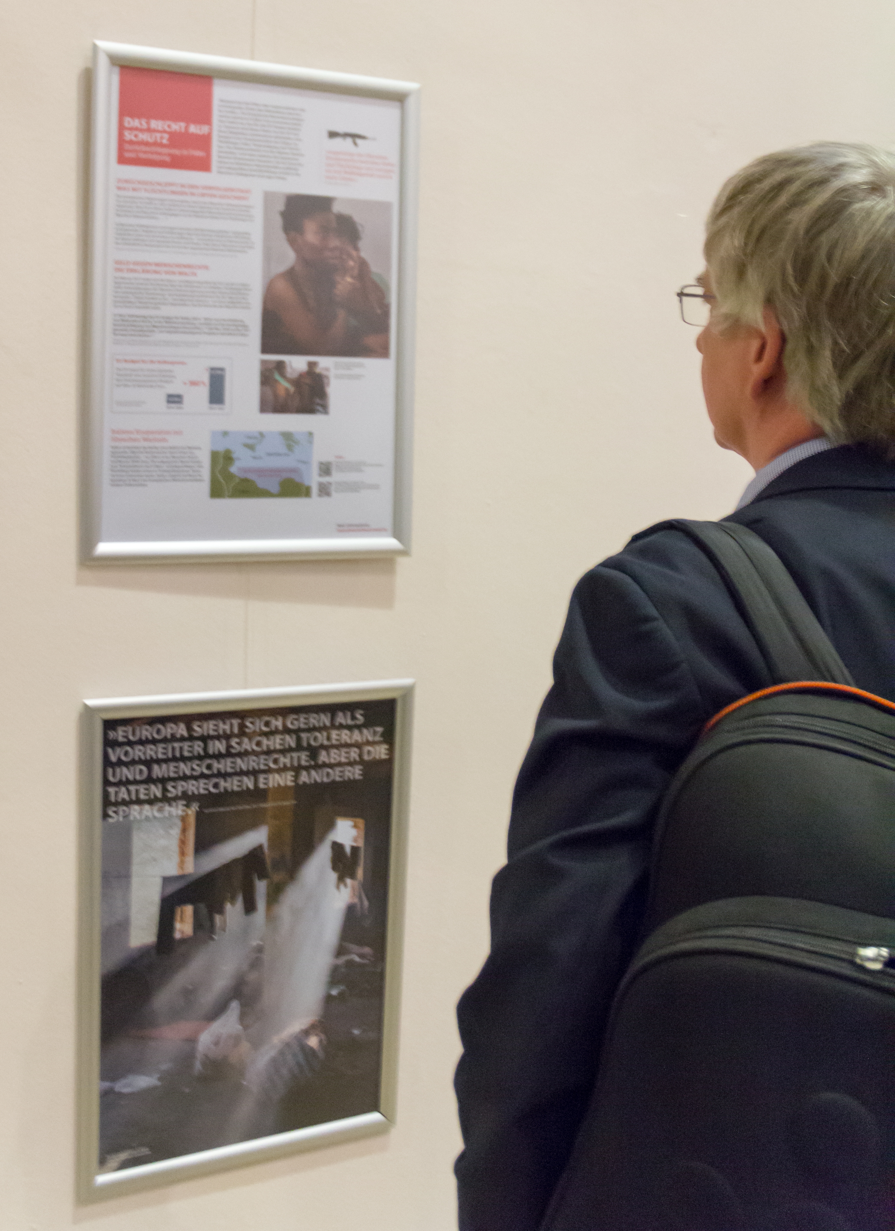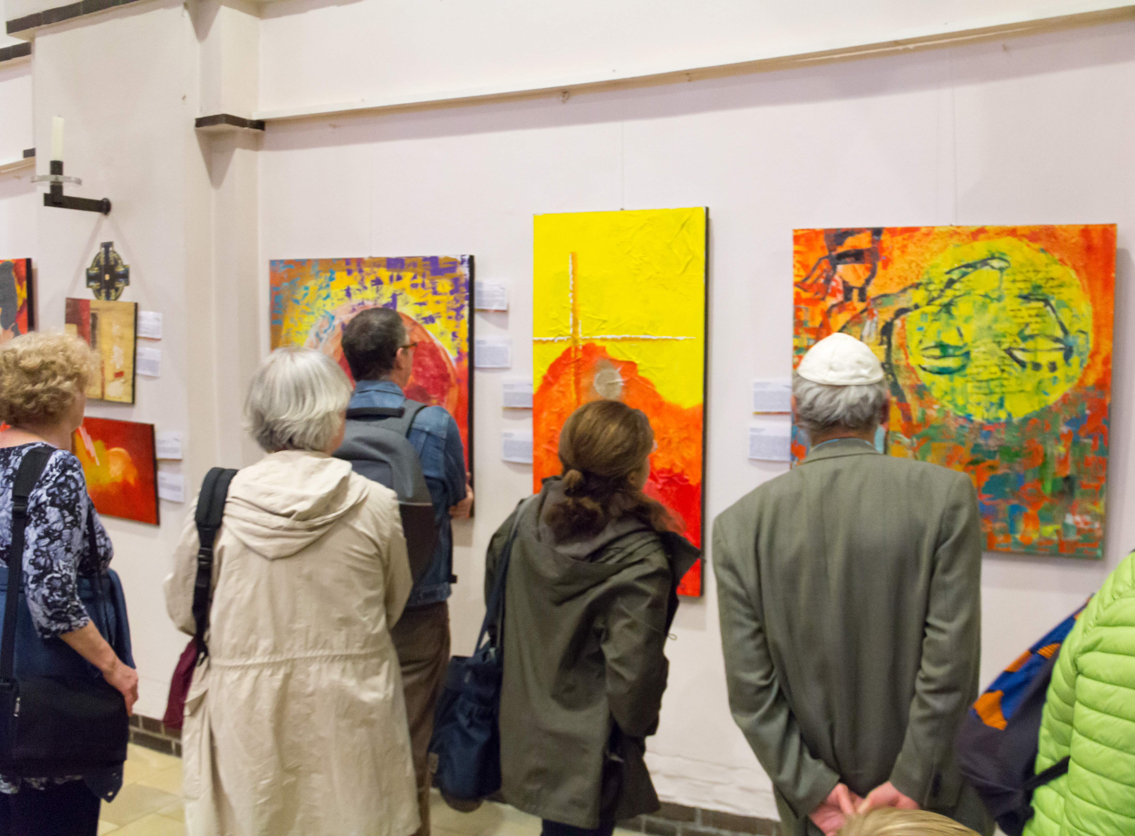 Es folgte ein einführendes politisches Statement von Katarina Niewiedzial, der Beauftragten des Senats von Berlin für Integration und Migration, die das Thema der PRO-ASYL-Ausstellung im Kirchenraum "Menschen & Rechte sind unteilbar" aufgriff. Die Würdigung und Einführung in die Ausstellung "Life Intersection", in denen die Künstlerin Gisèle Nubuhoro ihre eigene Fluchtgeschichte verarbeitet, übernahm Hannes Langbein, der Kunstbeauftragte der Evangelischen Kirche Berlin-Brandenburg-schlesische Oberlausitz.