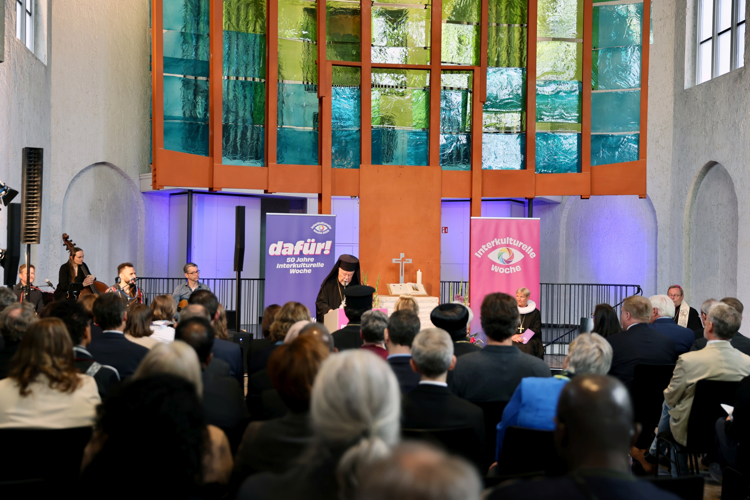 ich begrüße Sie alle herzlich zu diesem Gottesdienst, mit dem wir in die Jubiläumsfeier der Interkulturellen Woche einsteigen. Auch im Namen von Herrn Metropolit Augoustinos und Frau Bischöfin Fehrs darf ich Sie alle herzlich willkommen heißen. Es ist schön, dass Sie alle heute hier nach Berlin in die Genezarethkirche gekommen sind und dass wir gemeinsam dieses Fest feiern können. Eine ganz besondere Freude ist es uns, Sie, verehrter Herr Bundespräsident, in unserer Mitte begrüßen zu dürfen. Danke, dass Sie gekommen sind und auch diesen Gottesdienst mit uns feiern!