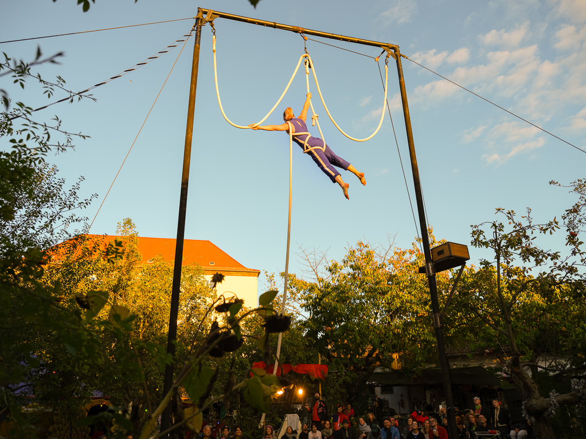 In Analogie zur gesellschaftlich geschürten Unsicherheit, die zu Angst führt, die wiederum zu Ressentiments und offenem Rassismus führt. Über diese Angst zu reden, die ich real habe, während ich in acht Metern Höhe schwinge, fliege und falle. Die Angst, die mir diese Gesellschaft manchmal macht.