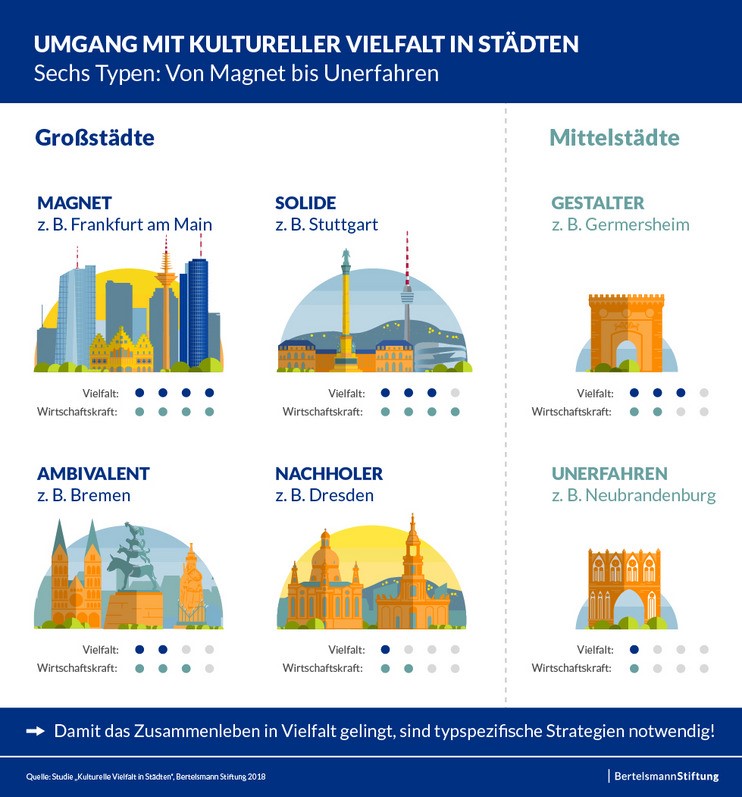 Es gibt jedoch deutliche Unterschiede in der Zusammensetzung der Bevölkerung und beim Umgang mit einwanderungsbedingter Vielfalt in den Städten und Gemeinden in Deutschland. Es gibt Städte, die stark von der Arbeitsmigration der 1960er Jahre geprägt sind. Vielfalt ist hier zwar nichts Neues und es gibt bereits langjährige Erfahrungen und auch Erfolge mit Integration vorzuweisen, aber häufig sind die wirtschaftlichen und sozialen Bedingungen in diesen alten Industriezentren problematisch. Andere Städte stehen auf den ersten Blick besser da: Metropolen wie Hamburg, Frankfurt am Main oder München sind heute schon enorm divers und ziehen mit hoher Lebensqualität, interessanten Jobs, attraktiven Bildungsangeboten und einer lebendigen Kulturszene Einwanderung aus dem Ausland in hohem Maße an. Dieser wirtschaftliche Erfolg hat aber auch seine Schattenseiten. Beispielsweise sorgen hohe Mieten für einen enormen Konkurrenzkampf bei der Wohnungssuche.