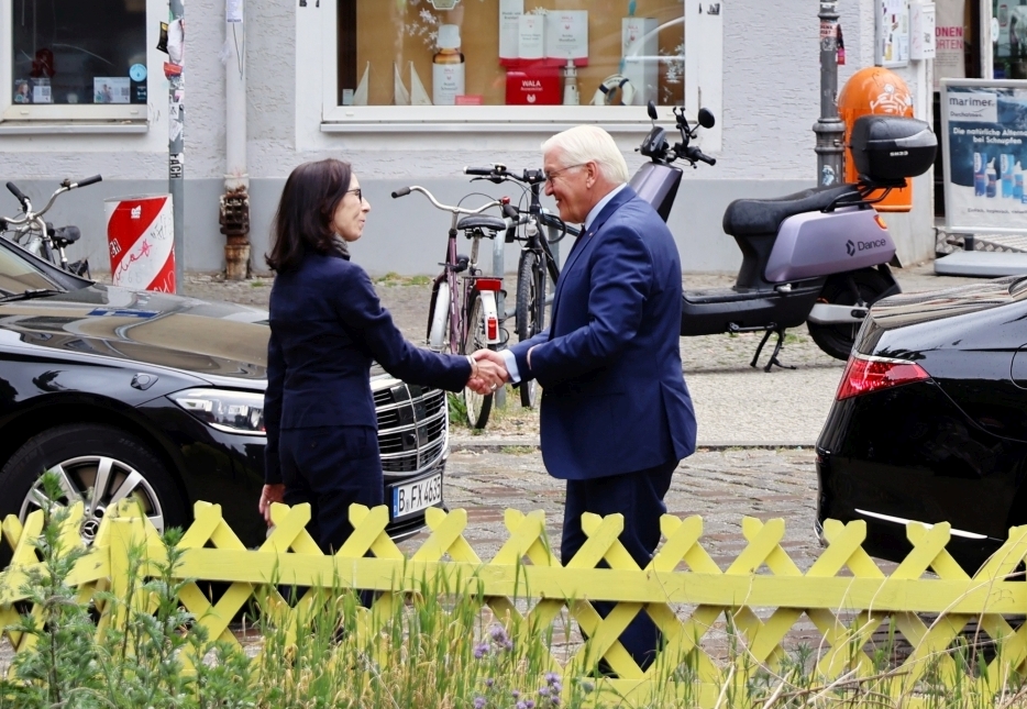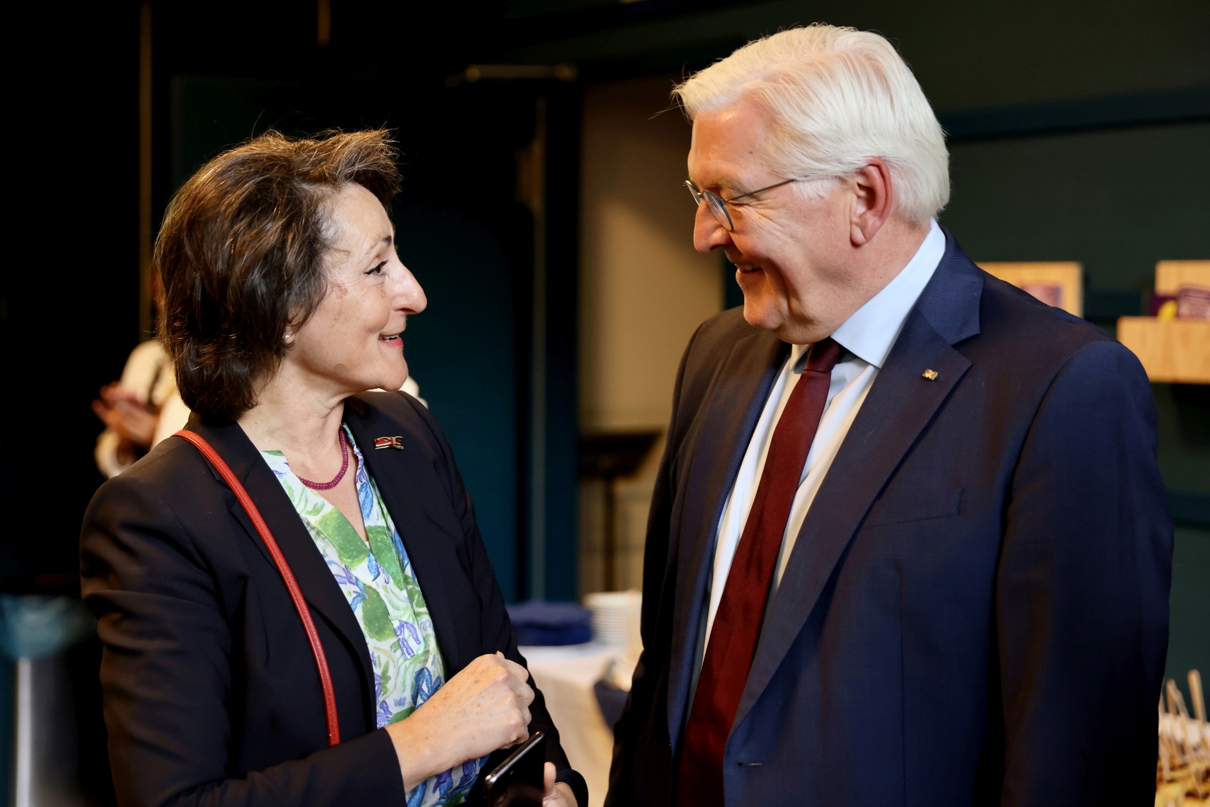 Beate Sträter, die Vorsitzende des Ökumenischen Vorbereitungsausschusses zur Interkulturellen Woche, dankte in ihrer Begrüßung Bundespräsident Steinmeier und den weiteren Gästen für ihr Kommen: "Wir sehen darin ein Zeichen der Ermutigung und Anerkennung, der vielen Menschen, überall in unserem Land, die sich seit langer Zeit für ein friedliches und gerechtes Miteinander einsetzen. Sie tun dies auch gegen wachsende Widerstände und das Bestreiten und Bekämpfen der Vielfalt unsere Gesellschaft und der Gleichheit aller hier lebender Menschen. Gerade deshalb ist auch ein öffentliches und sichtbares Zeichen wichtig, dass wir DAFÜR sind: Für Teilhabe, für Gleichbehandlung, für die Achtung der Menschenrechte, für die Akzeptanz von Unterschiedlichkeit, für ein friedliches Zusammenleben."