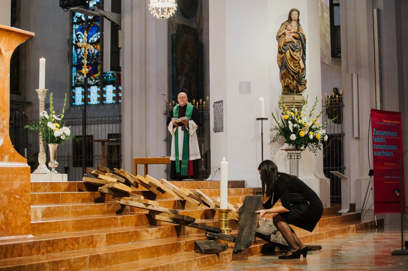 Während der Fürbitten im Auftaktgottesdienst wurden die fehlenden Teile eingesammelt und wieder an ihre alte Stelle im Kreis gelegt. Der Ring, als Symbol der Gemeinschaft von Menschen unterschiedlichster Herkunft, Kultur und Religion, ist jetzt wieder geschlossen. Was bleibt, sind die schwarzen Spuren der Verletzungen. Das schrittweise Wieder-Zusammenfügen des Kreises stand symbolisch für den Prozess der Heilung einer starken Vielfaltsgesellschaft, die bleibende Wunden nicht überspielt.