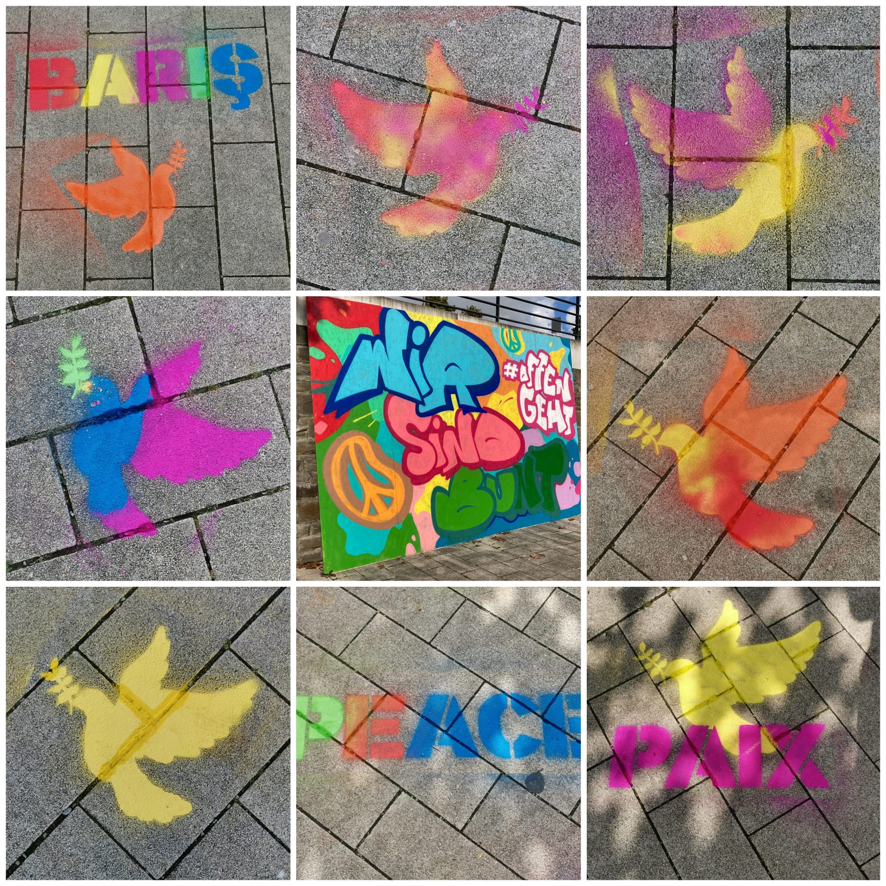 Unter der Anleitung des Künstlers Marcel Veneman fand hatte schon 2021 eine kreative Solidaritätsaktion stattgefunden, um zu zeigen, wie offen und friedlich die Stadt Arnsberg und Ihre Bewohner*innen sind. Gemeinsam kreierten 120 Arnsberger einen bunten Pfad auf dem Ruhrtalradweg als sichtbares Zeichen für den Frieden. Mit bereit gestellten Schablonen, in denen das Wort Frieden in 25 Sprachen zur Auswahl stand, und Sprühfarben konnte jeder seine Fläche gestalten.
