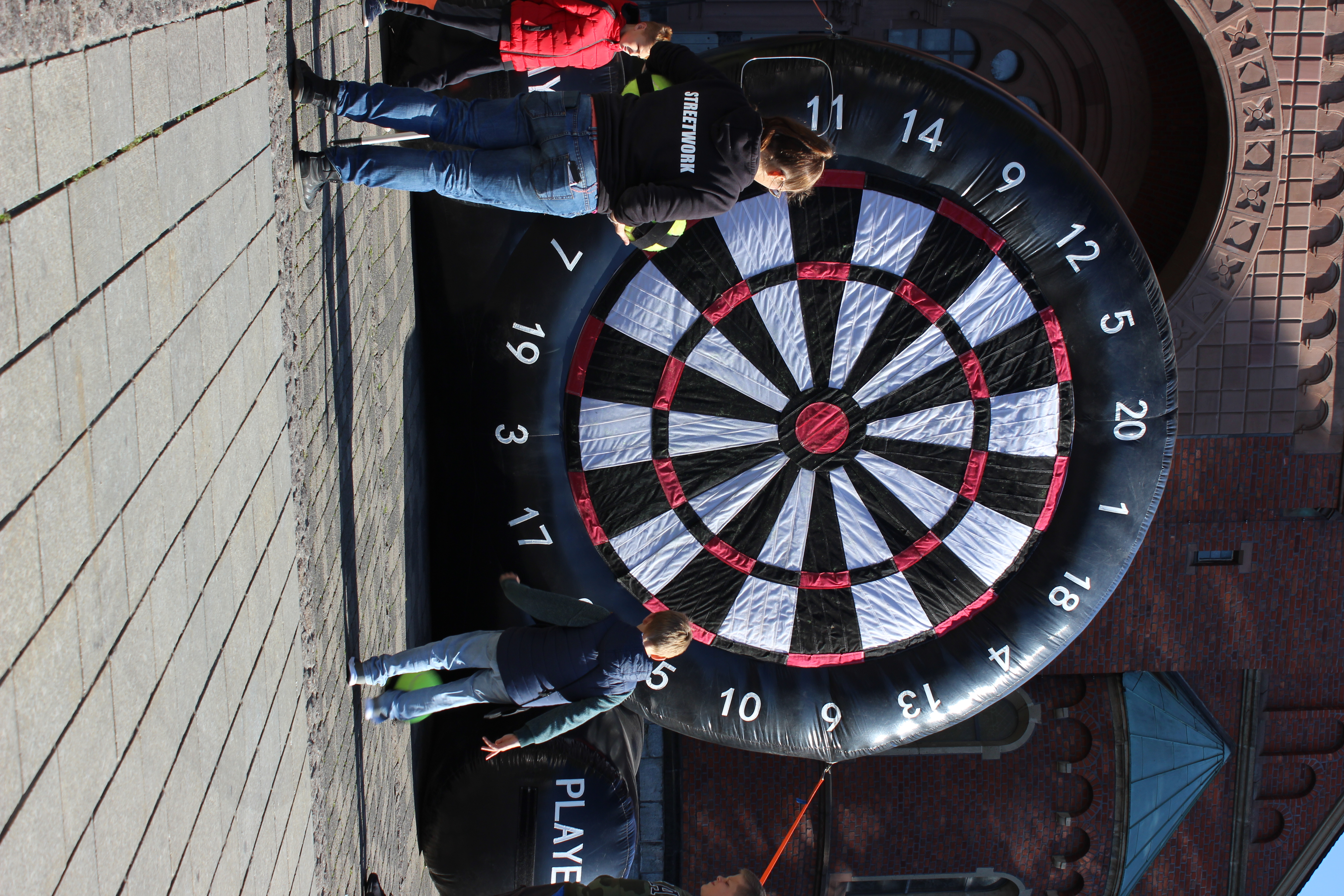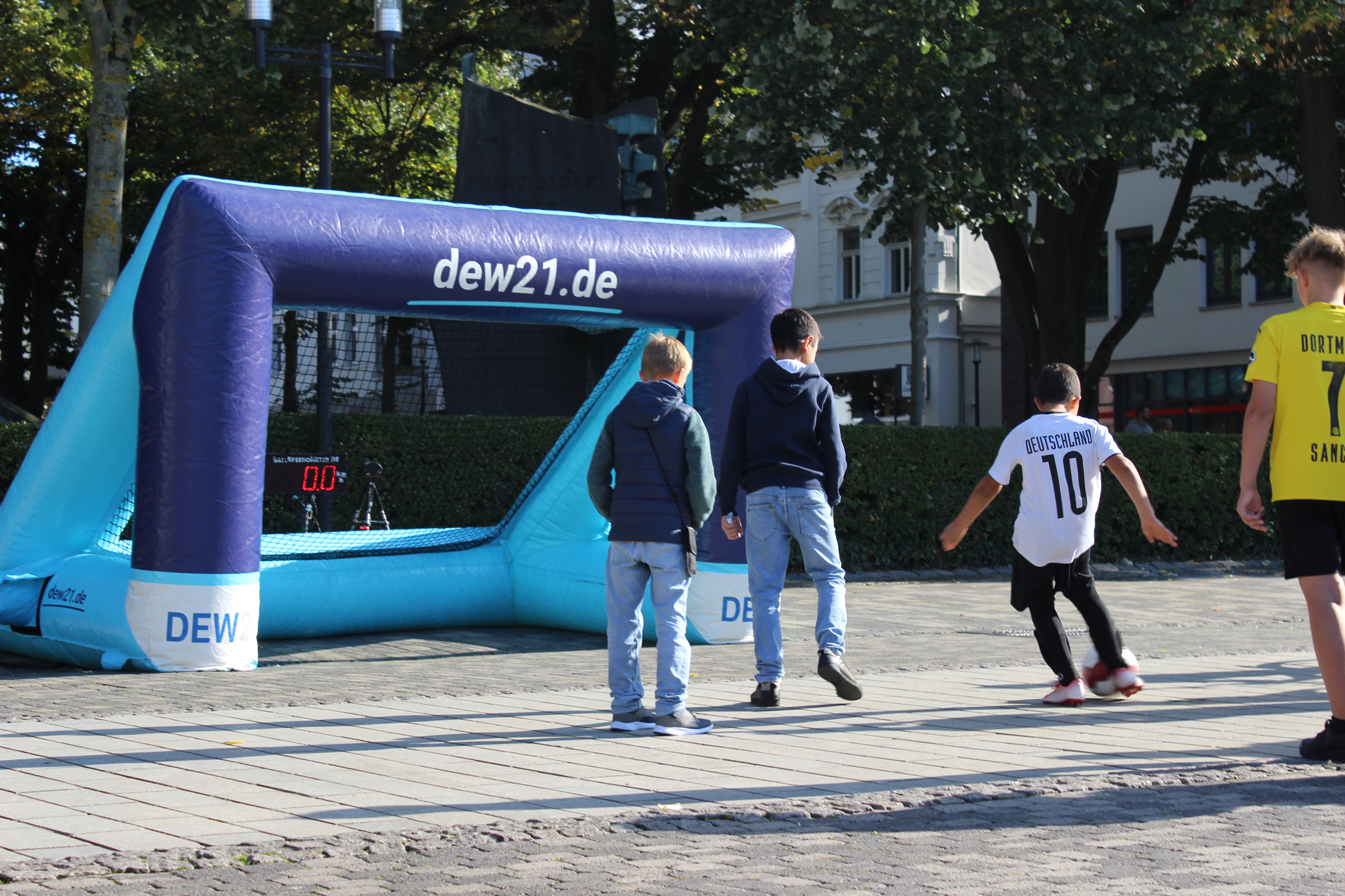Streetkick gilt als moderne und inklusive Form des Straßenfußballs, bei der sich junge Balltalente austoben können und bei der, unabhängig von Hautfarbe, Geschlecht, Alter und Fähigkeit, jeder und jede mitmachen kann. Sehr passend also, um dies an das Motto der diesjährigen Interkulturellen Woche "Offen geht", anzudocken. Bei bestem Wetter schauten im Laufe des Nachmittags einige hundert Menschen am Neheimer Markt vorbei – entweder um selbst gegen das runde Leder zu treten oder aber um die gute Atmosphäre zu genießen. Neben anderen Kooperationspartnern beteiligten sich auch die Streetworker*innen der Stadt Arnsberg mit einer übergroßen, aufblasbaren Klettball-Dartscheibe und das Kinder- und Jugendzentrum Neheim mit einem Waffel- und Sandwichstand an der sehr erfolgreichen Aktion.