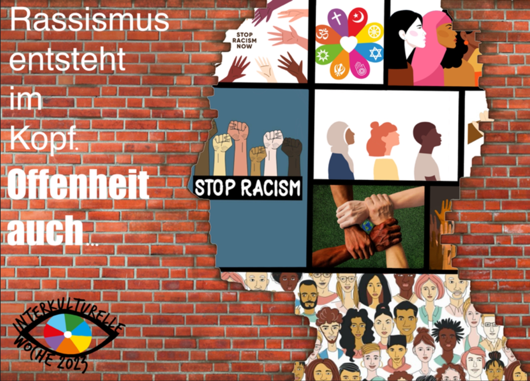 Die Mittelschule Dietenhofen im Landkreis Ansbach in Mittelfranken hat sich mit einer tollen Aktion dem IKW-Motto "Neue Räume" künstlerisch und kreativ genähert. Dafür verwendeten die Organisierenden und die Schüler*innen unter anderem ein IKW-Motiv aus früheren Jahren, das aber immer noch brandaktuell ist und darum auch zum Download zur Verfügung steht: den „Mauerkopf“ mit dem Slogan "Rassismus entsteht im Kopf. Offenheit auch".
