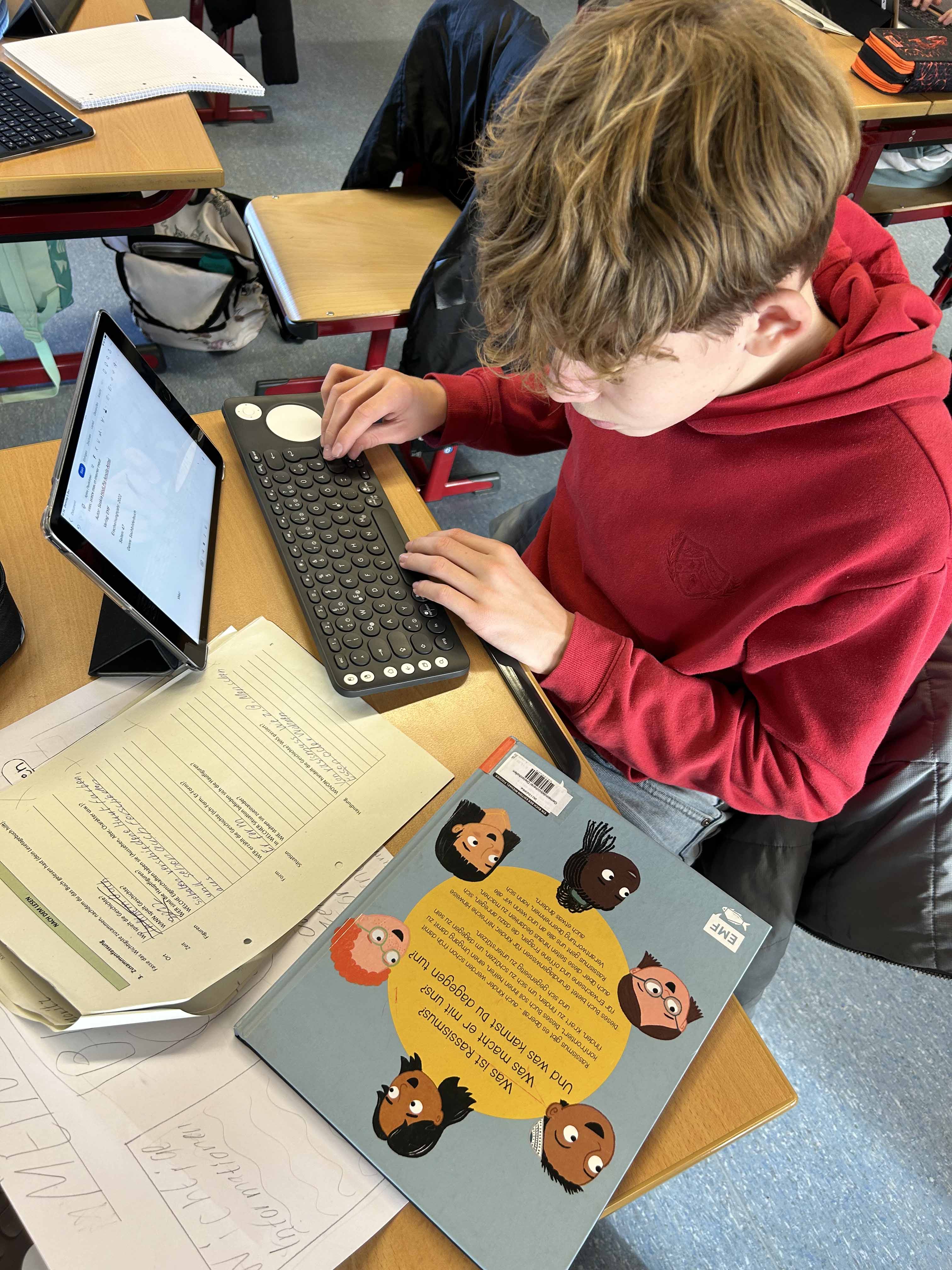 Die Siebtklässler:innen setzten sich zunächst inhaltlich mit dem Begriff "Rassismus" auseinander. Danach gestalteten sie im Rahmen des Kunstunterrichts individuell ausgewählte Szenen des Wimmelbilds am Tablet und ergänzten sie mit aussagekräftigen Sprechblasen zum Thema.