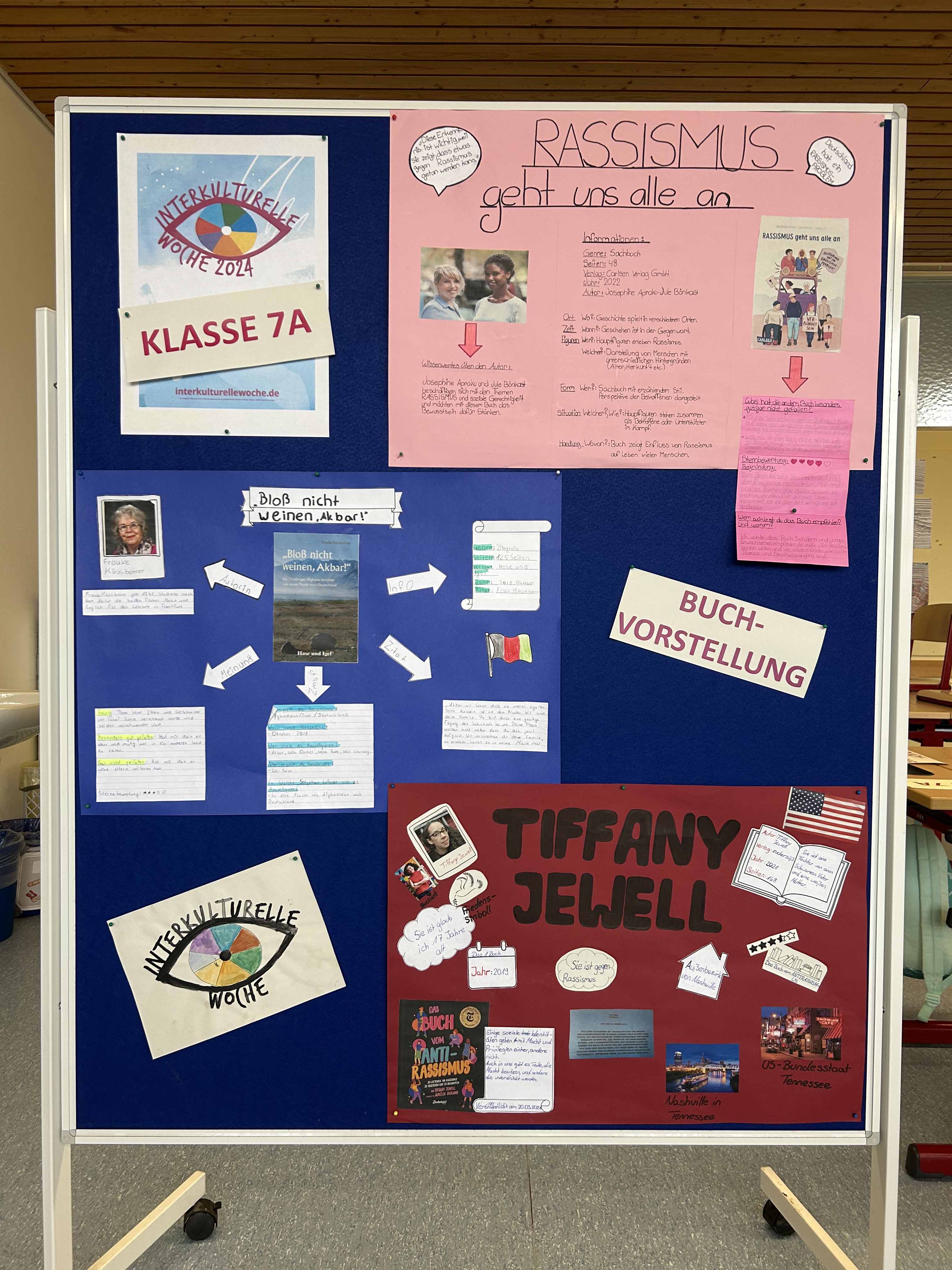 Die Kunstwerke wurden schließlich im Schulgebäude ausgestellt, dazu wurde passende Literatur aus der Gemeindebücherei anhand einer Buchvorstellung in Plakatform präsentiert. Das sollte alle Schüler:innen zu erreichen, zu sensibilisieren und zum Lesen anzuregen.
