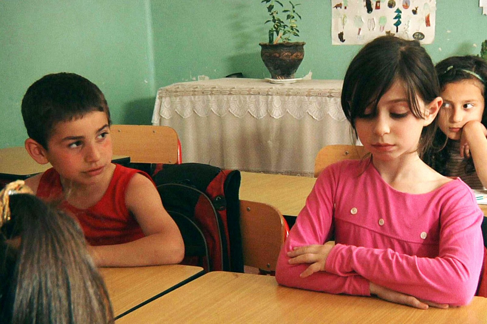 Nach Ende des Kaukasus-Konflikts kommt das Flüchtlingskind Tamari neu in eine georgische Schule. Von ihrer Mutter hat sie eine Packung Filzstifte bekommen, auf die sie gut aufpassen soll und die sie stolz in der Klasse auspackt. Doch ihrem Sitznachbar, dem russischen Jungen Datho, passt das gar nicht. Er ist neidisch auf Tamari, vor allem, nachdem sie ihn im Laufen besiegt hat. Wütend nimmt er ihr die Stifte weg und wirft sie vor ein Auto. Tamari ist todunglücklich, verpetzt Datho aber nicht, der davon richtig beeindruckt ist. Offenbar sind nicht alle Mädchen doof. Eine kleine feine Geschichte mit ganz wenig Worten erzählt hier die Regisseurin Eka Papiashvili. Es braucht auch wenig Dialog für den Konflikt, der hier mit feinen Zwischentönen und spannender Blickdramaturgie wiedergegeben wird. Dabei verhandelt ihr Film viel mehr als nur die Annäherung zweier Kinder. Es geht um das Zusammenleben von Kulturen und Nationen, um beendete und noch immer schwelende Konflikte, um Krieg und Frieden, um das Miteinander und das langwierige Heilen von Narben. Wenn es dazu überhaupt eine Chance gibt, dann liegt sie in den Händen der unschuldigen Kinder. Diese wichtige Botschaft kann von Zuschauern in jedem Alter verstanden werden. Ein Film mit wunderbaren klug gewählten Bildern und toll gespielten Charakteren. Ein würdiger Murnau-Kurzfilmpreisträger des Jahres 2013.