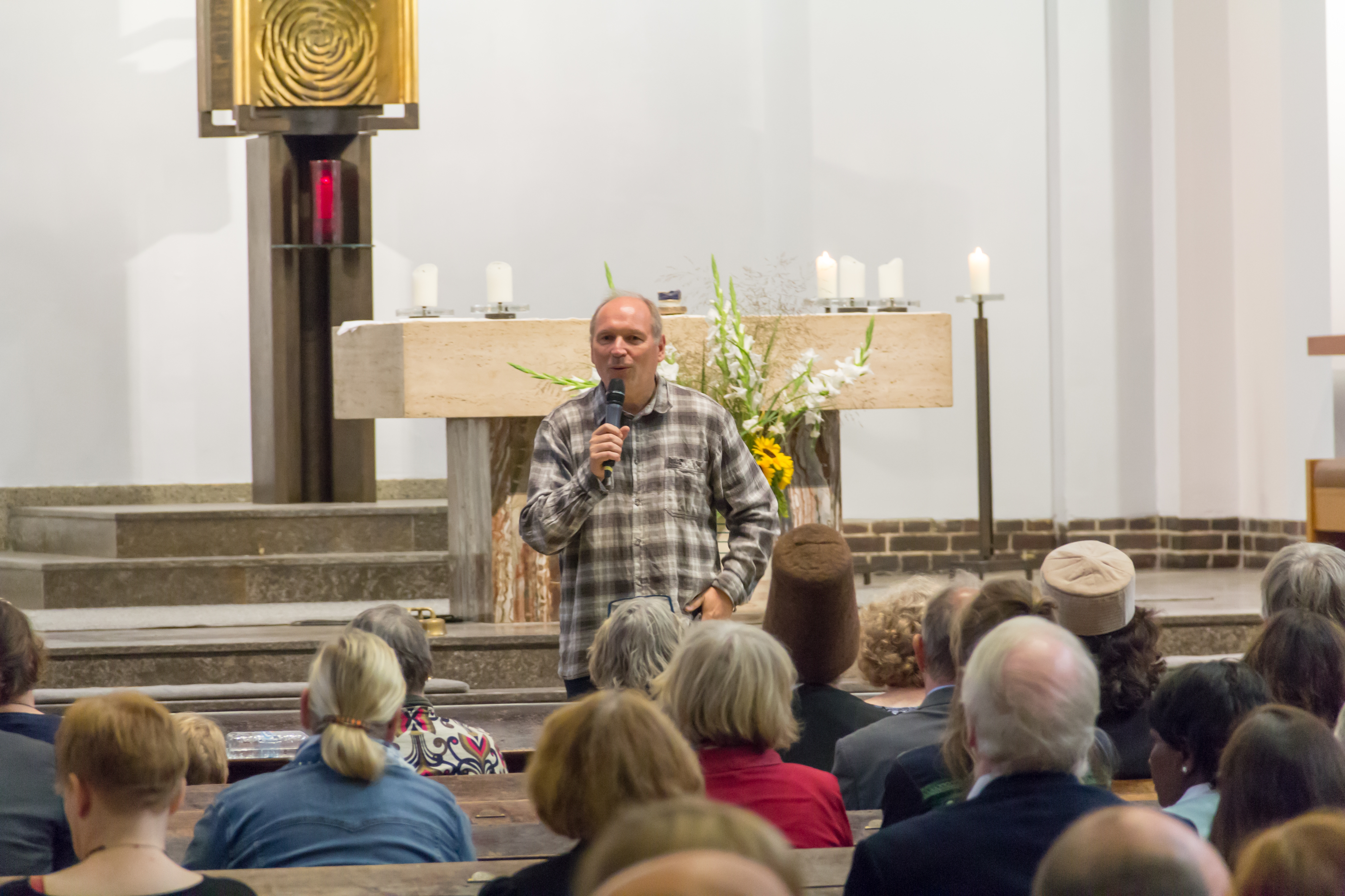 Nach der Begrüßung durch Michael Haas-Busch vom Berliner Ökumenischen Vorbereitungsausschuss (ÖVA) und den gastgebenden Pfarrer Kalle Lenz lasen nacheinander Imam Taha Sabri von der Neuköllner Begegnungsstätte Dar Al-Salam, Itai Böing von der Jüdischen Gemeinde zu Berlin und Pastoralreferentin Lissy Eichert von der katholischen Kirchengemeinde St. Christophorus aus ihren heiligen Schriften und sprachen ein Gebet um Frieden, dazwischen gab es meditative Musik.