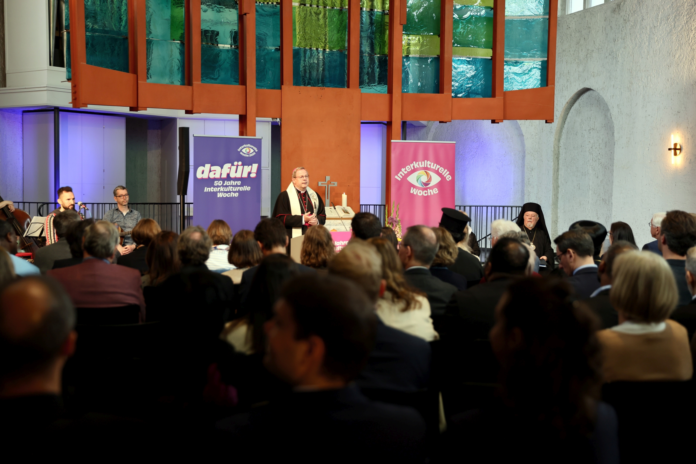 Ein Gottesdienst ist keine Auswertung eines Projekts, keine Evaluierung oder Bilanz. Er justiert vielmehr die Dinge neu. Jeder Gottesdienst in allen unseren Kirchen und Religionsgemeinschaften versucht dies: den Bezug zu unserem Gott wieder neu zu entdecken und wiederherzustellen. Auch dieser Gottesdienst hat uns an die Ebenbildlichkeit aller Menschen erinnert, dass also jeder Mensch das ewige Bild Gottes in sich trägt. Für uns Christinnen und Christen ist das der Ausgangspunkt unseres interkulturellen Handelns, also auch der Interkulturellen Woche. Man hat zu Recht behauptet, dass wir das Paradies auf Erden verloren haben. Die Sehnsucht aber nach dem Paradies, das heißt nach der Verwirklichung unserer Gottesnähe und unserer Ähnlichkeit mit dem Bild Gottes, lebt in uns weiter. Das ist für die Christinnen und Christen gleich welcher Konfession der wahre Ursprung und die tatsächliche Bestimmung des Menschen, das ist die Kultur, die uns alle verbindet. Wir sind dankbar in einem Land zu leben, das diesen Gottesbezug nicht verloren hat, und werden weiter in diesem Land dafür tätig sein. Und – ganz persönlich gesprochen – bin ich froh, dass die Idee, die wir vor 50 Jahren hatten, weiterlebt und neue, frische Kräfte an ihrer Realisierung weiterarbeiten. Als orthodoxer Christ und Bischof meiner Kirche darf ich hinzufügen: Wir waren dabei und wir bleiben dabei! Dazu segne uns Gott.