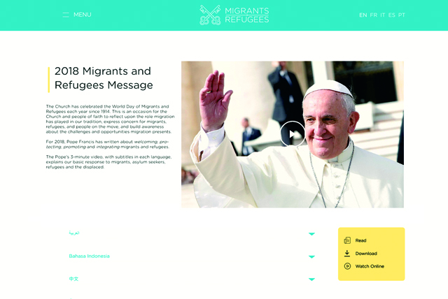 Für das Jahr 2018 hat Papst Franziskus ein dreiminütiges Video, untertitelt in vielen Sprachen, veröffentlicht. Er erklärt dort die gemeinsame Verantwortung gegenüber Migrant*innen, Asylsuchenden, Flüchtlingen und Vertriebenen. In seiner Botschaft zum 104. Welttag des Migranten und in seinem Video bekräftigt er: "dass man unsere gemeinsame Antwort in vier Verben gemäß den Grundsätzen der Lehre der Kirche aufgliedern könnte: aufnehmen, schützen, fördern und integrieren[2]."