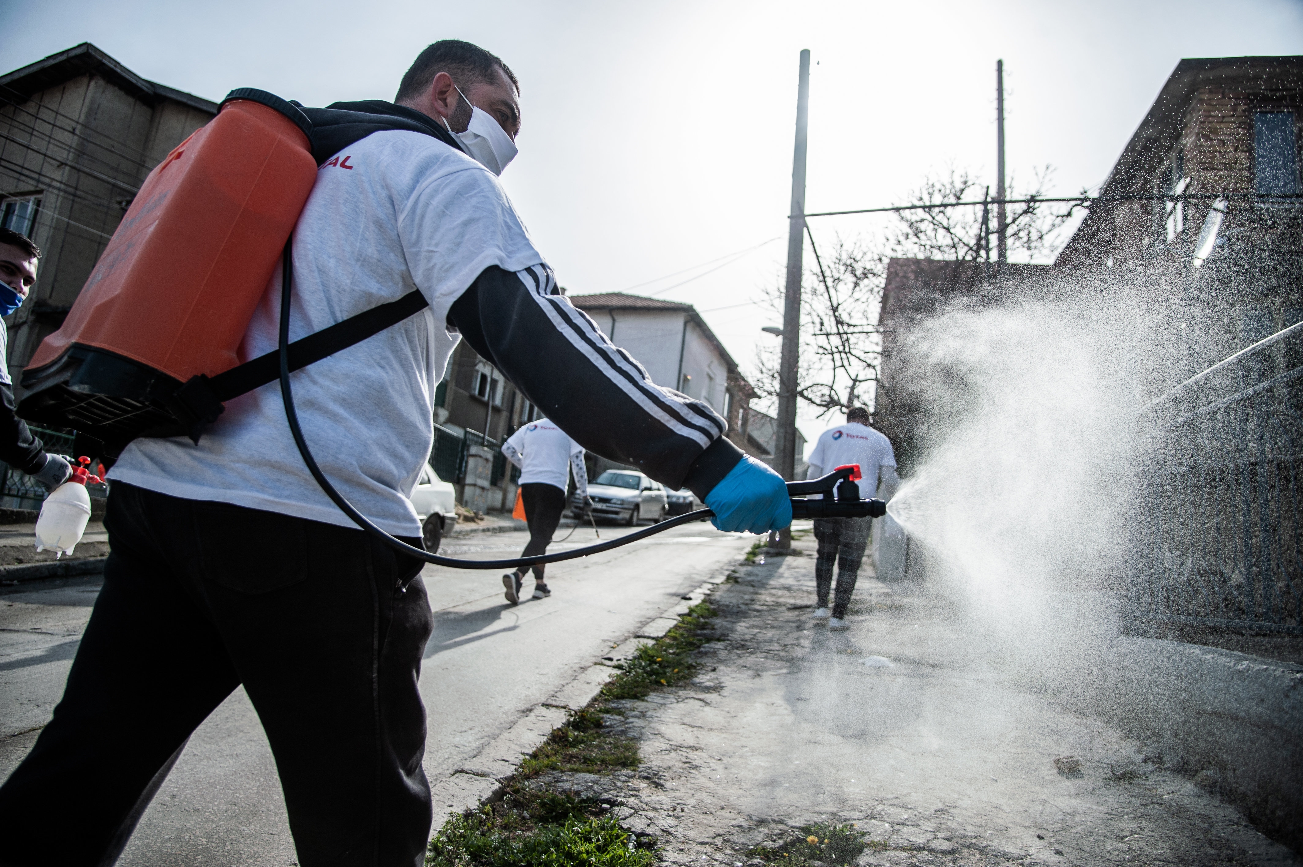 Junge Freiwillige desinfizieren die Straßen in einem überwiegend von Roma bewohnten Viertel der bulgarischen Stadt Varna.
